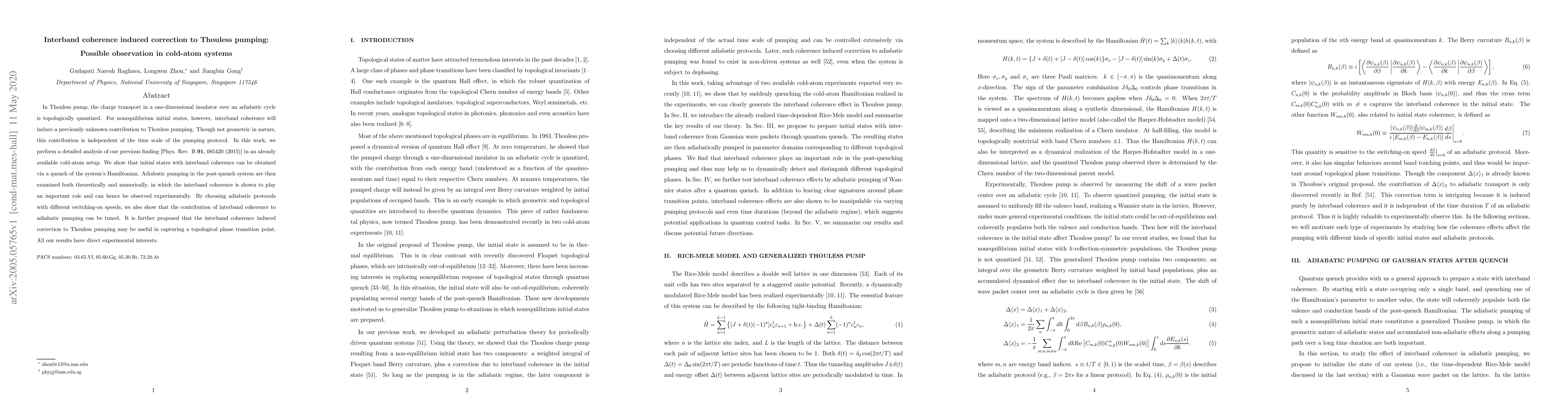 This paper investigates the impact of interband coherence on Thouless pumping in cold-atom systems, revealing a non-geometric contribution independent of the pumping protocol's time scale. The study proposes that this coherence-induced correction can be experimentally observed and tuned via adiabatic protocols, potentially aiding in detecting topological phase transitions.