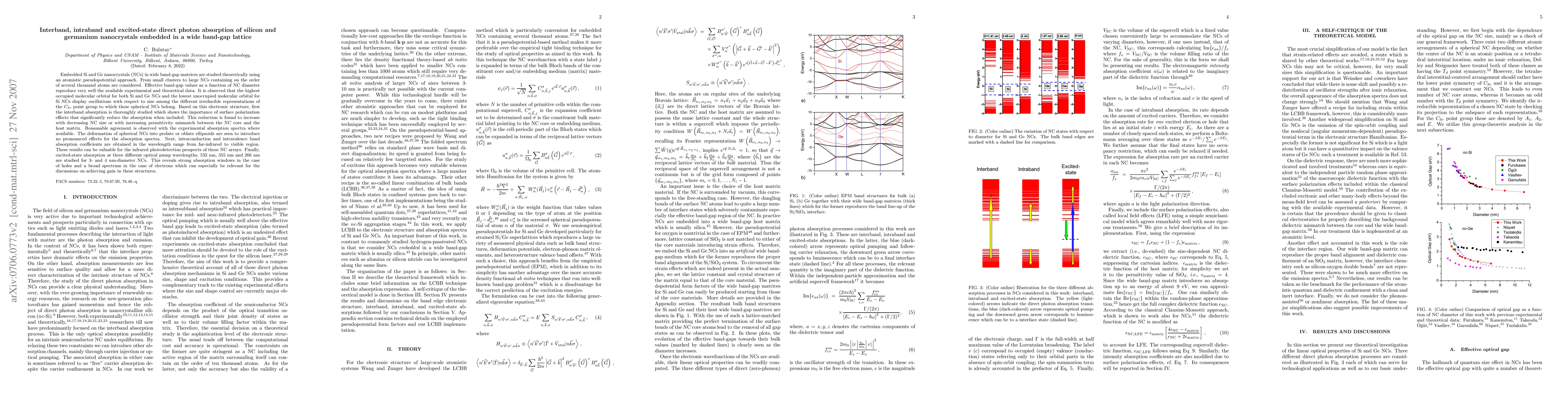 Embedded Si and Ge nanocrystals (NCs) in wide band-gap matrices are studied theoretically using an atomistic pseudopotential approach. From small clusters to large NCs containing on the order of several thousand atoms are considered. Effective band-gap values as a function of NC diameter reproduce very well the available experimental and theoretical data. It is observed that the highest occupied molecular orbital for both Si and Ge NCs and the lowest unoccupied molecular orbital for Si NCs display oscillations with respect to size among the different irreducible representations of the $C_{3v}$ point group to which these spherical NCs belong. Based on this electronic structure, first the interband absorption is thoroughly studied which shows the importance of surface polarization effects that significantly reduce the absorption when included. This reduction is found to increase with decreasing NC size or with increasing permittivity mismatch between the NC core and the host matrix. Reasonable agreement is observed with the experimental absorption spectra where available. The deformation of spherical NCs into prolate or oblate ellipsoids are seen to introduce no pronounced effects for the absorption spectra. Next, intraconduction and intravalence band absorption coefficients are obtained in the wavelength range from far-infrared to visible region. These results can be valuable for the infrared photodetection prospects of these NC arrays. Finally, excited-state absorption at three different optical pump wavelengths, 532 nm, 355 nm and 266 nm are studied for 3- and 4 nm-diameter NCs. This reveals strong absorption windows in the case of holes and a broad spectrum in the case of electrons which can especially be relevant for the discussions on achieving gain in these structures.