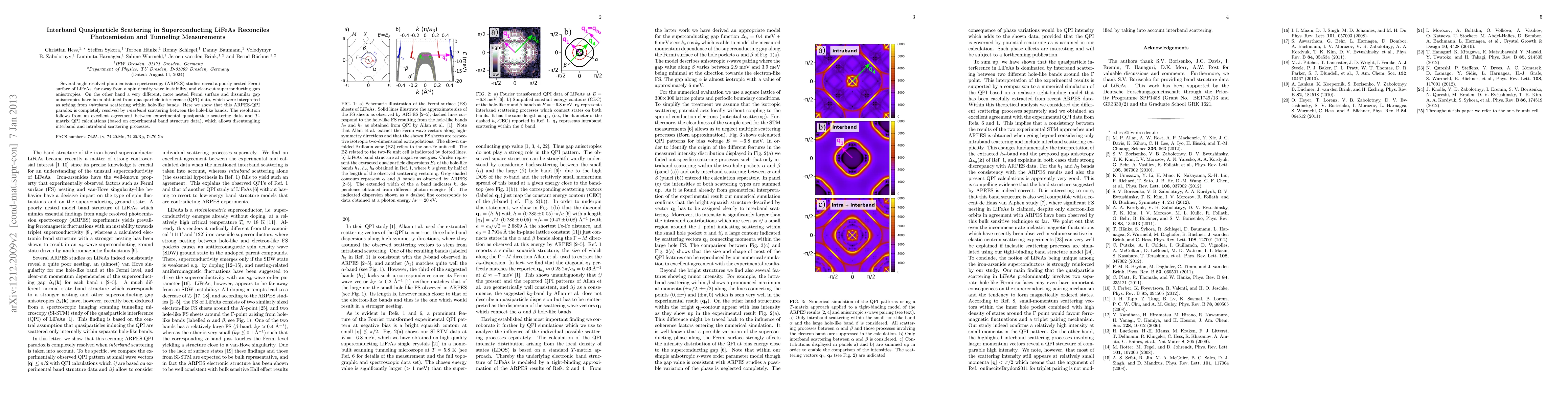This paper resolves discrepancies between ARPES and QPI measurements in superconducting LiFeAs by demonstrating that interband quasiparticle scattering reconciles the differing Fermi surface and gap anisotropy observations, supported by T-matrix QPI calculations.