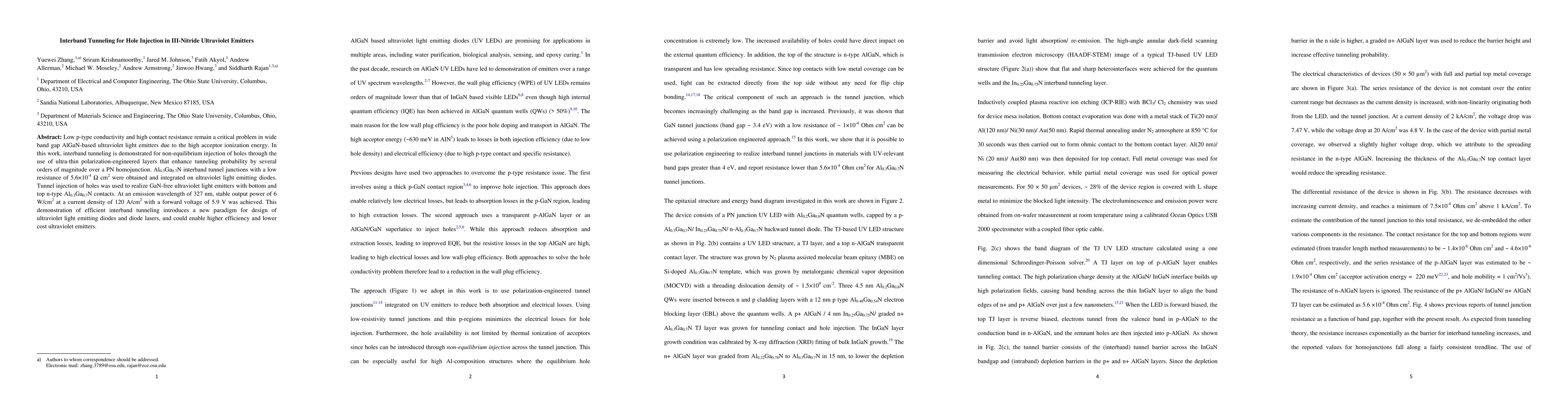 This paper demonstrates efficient interband tunneling for hole injection in III-nitride ultraviolet emitters, overcoming challenges of low p-type conductivity and high contact resistance. Polarization-engineered tunnel junctions significantly enhance tunneling probability, paving the way for more efficient and cost-effective ultraviolet light emitting diodes and lasers.