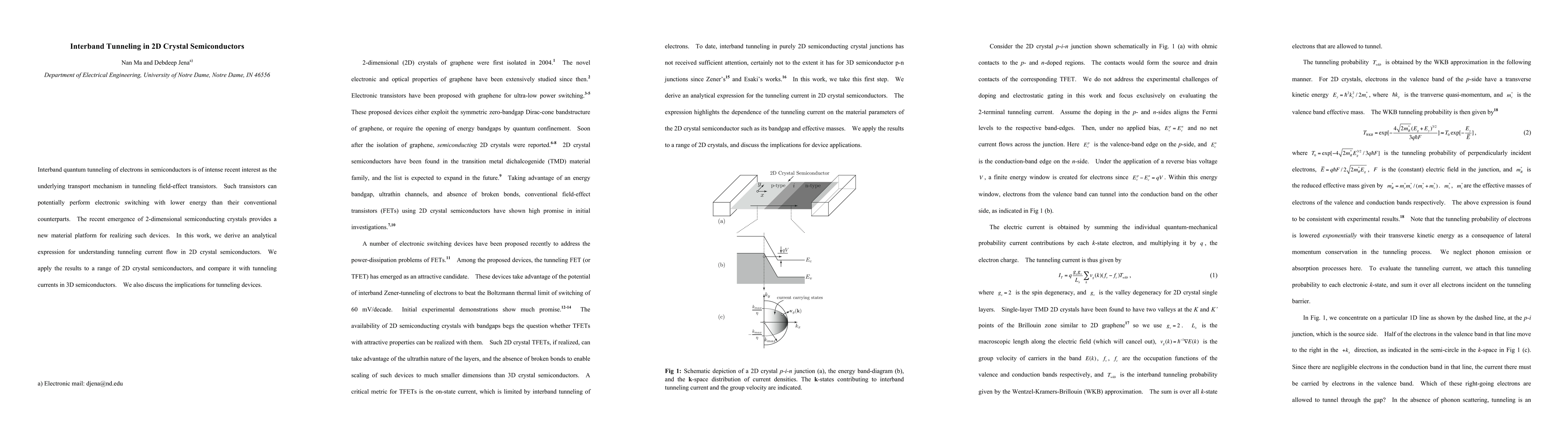 This paper derives an analytical expression for interband tunneling current in 2D crystal semiconductors, comparing it with 3D semiconductors to understand the underlying transport mechanism in tunneling field-effect transistors, which may enable lower energy electronic switching. The study highlights the potential of 2D materials for advanced electronic devices.