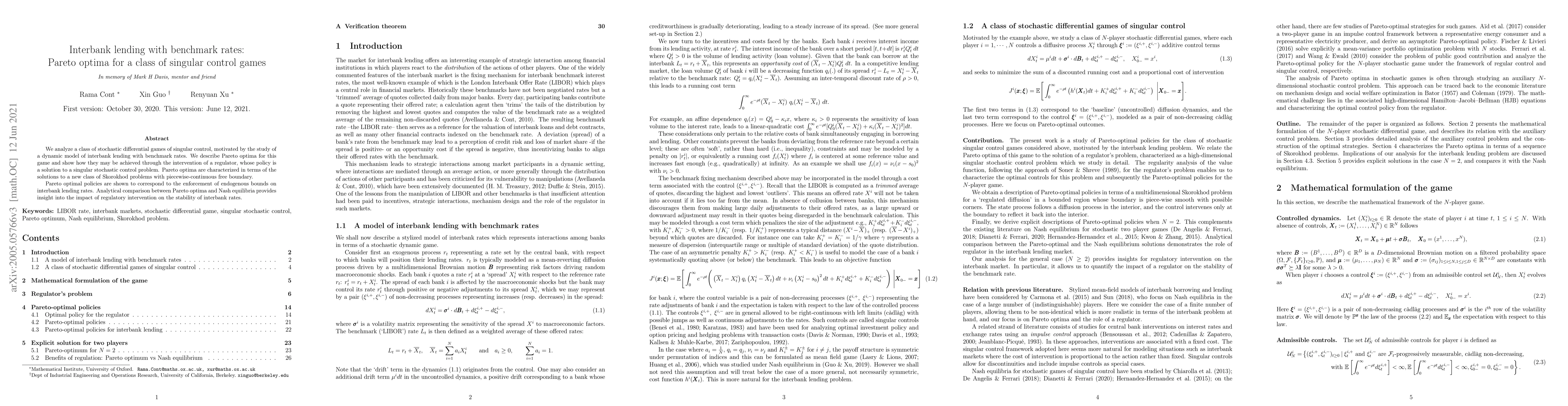 We analyze a class of stochastic differential games of singular control, motivated by the study of a dynamic model of interbank lending with benchmark rates. We describe Pareto optima for this game and show how they may be achieved through the intervention of a regulator, whose policy is a solution to a singular stochastic control problem. Pareto optima are characterized in terms of the solutions to a new class of Skorokhod problems with piecewise-continuous free boundary. Pareto optimal policies are shown to correspond to the enforcement of endogenous bounds on interbank lending rates. Analytical comparison between Pareto optima and Nash equilibria provides insight into the impact of regulatory intervention on the stability of interbank rates.