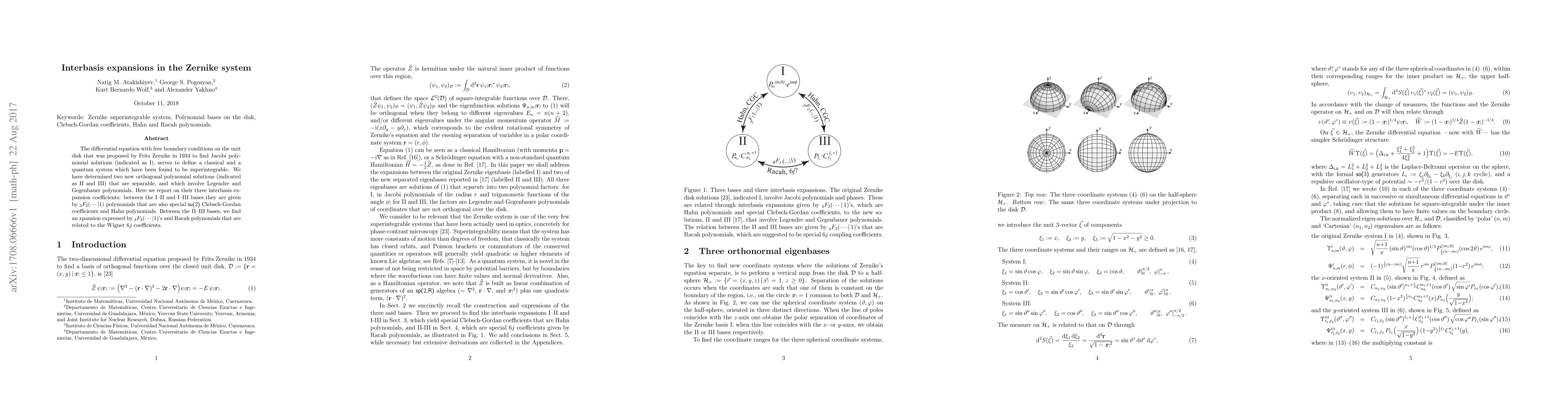This paper explores interbasis expansions in the Zernike system, identifying new orthogonal polynomial solutions (II and III) that are separable and involve Legendre and Gegenbauer polynomials. The study determines interbasis expansion coefficients between these solutions, revealing special functions such as $_3F_2$ and $_4F_3$ polynomials and connections to su($2$) Clebsch-Gordan and Racah polynomials.