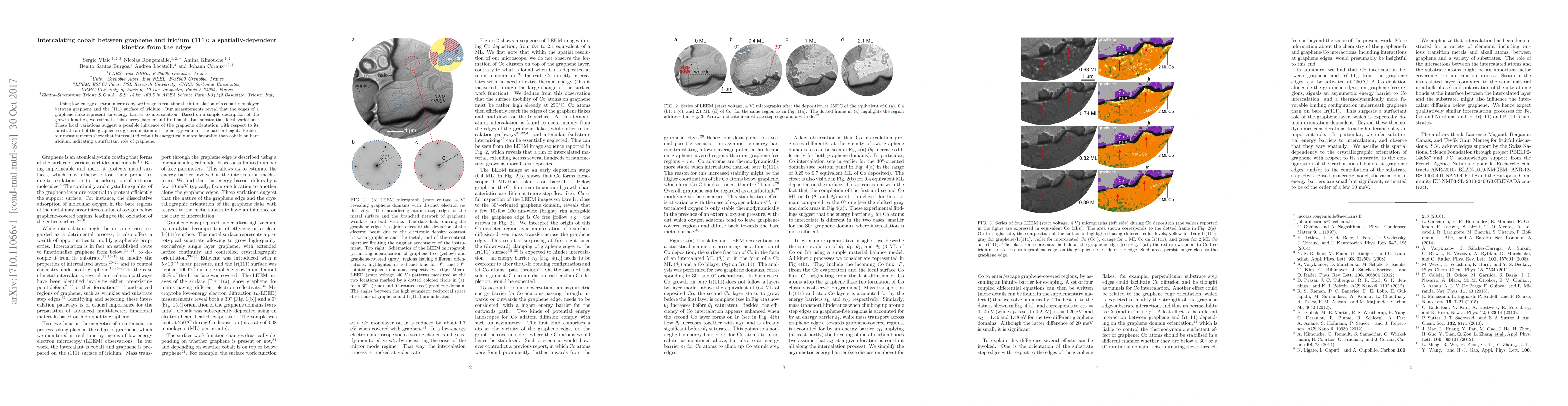Using low-energy electron microscopy, we image in real time the intercalation of a cobalt monolayer between graphene and the (111) surface of iridium. Our measurements reveal that the edges of a graphene flake represent an energy barrier to intercalation. Based on a simple description of the growth kinetics, we estimate this energy barrier and find small, but substantial, local variations. These local variations suggest a possible influence of the graphene orientation with respect to its substrate and of the graphene edge termination on the energy value of the barrier height. Besides, our measurements show that intercalated cobalt is energetically more favorable than cobalt on bare iridium, indicating a surfactant role of graphene.