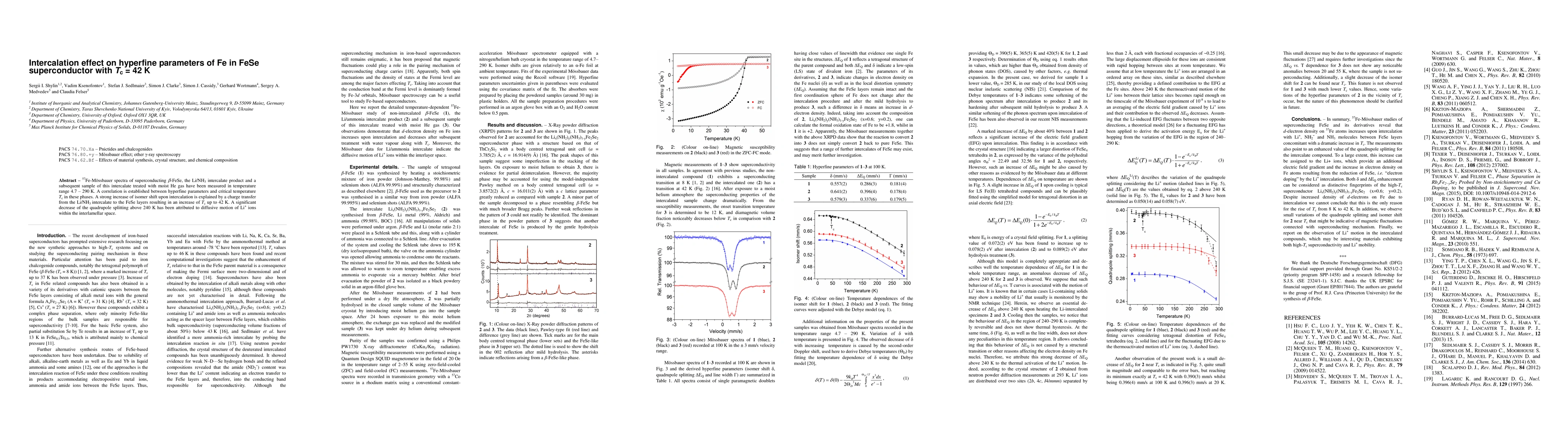 Researchers found a correlation between hyperfine parameters of Fe in FeSe superconductor and its critical temperature Tc. Intercalation with Li/NH3 increases Tc up to 42 K by transferring charge from the intercalate to FeSe layers.