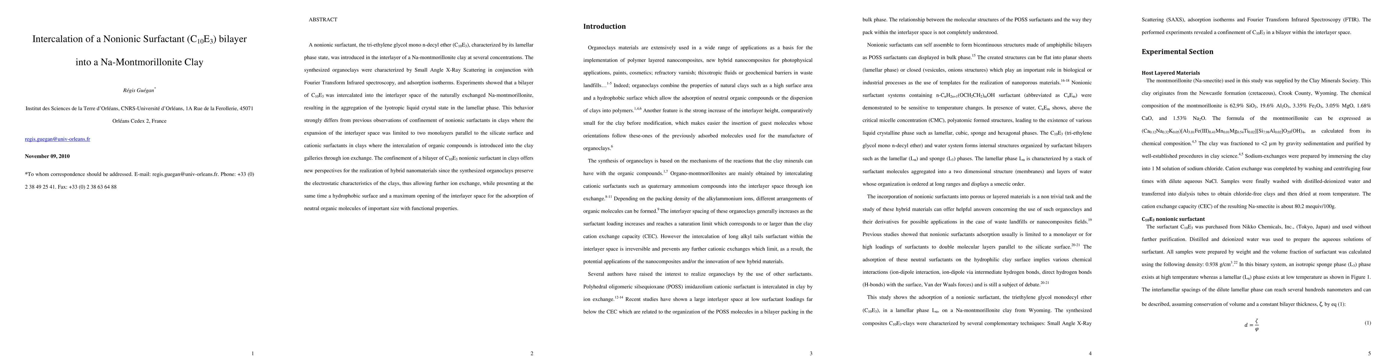 This study investigates the intercalation of a nonionic surfactant (C10E3) into Na-montmorillonite clay, revealing that a bilayer forms within the interlayer space, unlike previous monolayer observations. The resulting organoclays maintain clay electrostatic properties while offering a hydrophobic surface and expanded interlayer space for adsorbing larger organic molecules.
