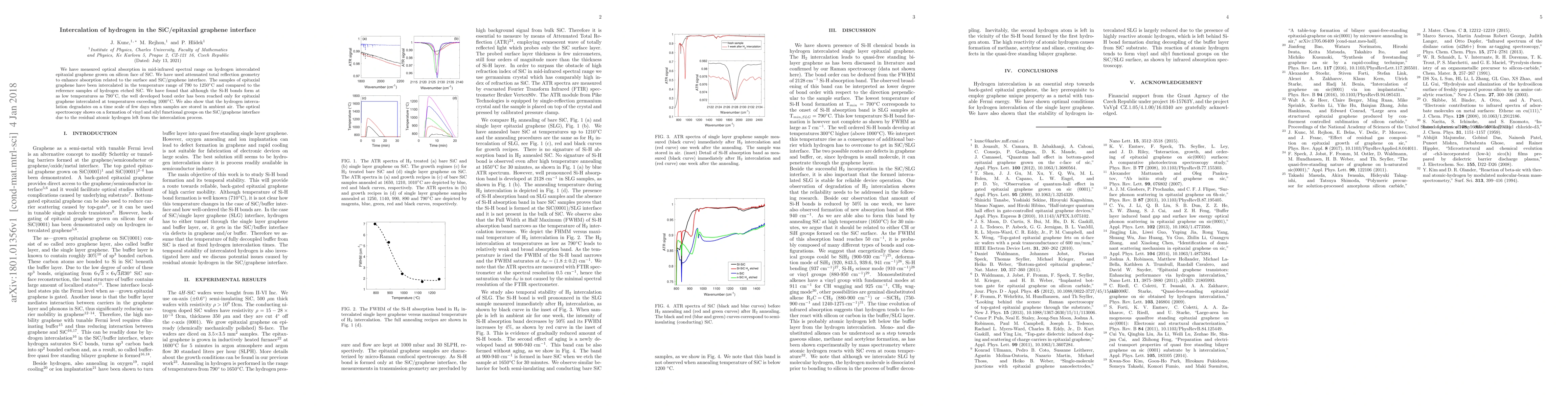 We have measured optical absorption in mid-infrared spectral range on hydrogen intercalated epitaxial graphene grown on silicon face of SiC. We have used attenuated total reflection geometry to enhance absorption related to the surface and SiC/graphene interface. The samples of epitaxial graphene have been intercalated in the temperature range of 790 to 1250$^\circ$C and compared to the reference samples of hydrogen etched SiC. We have found that although the Si-H bonds form at as low temperatures as 790$^\circ$C, the well developed bond order has been reached only for epitaxial graphene intercalated at temperatures exceeding 1000$^\circ$C. We also show that the hydrogen intercalation degradates on a time scale of few days when samples are stored in ambient air. The optical spectroscopy shows on a formation of vinyl and silyl functional groups on the SiC/graphene interface due to the residual atomic hydrogen left from the intercalation process.
