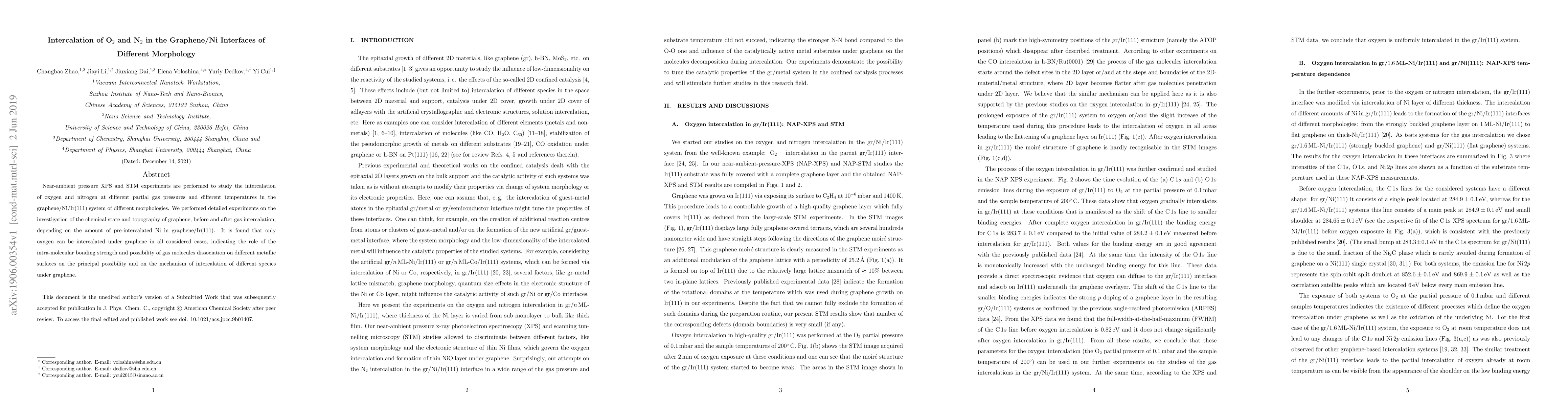 Near-ambient pressure XPS and STM experiments are performed to study the intercalation of oxygen and nitrogen at different partial gas pressures and different temperatures in the graphene/Ni/Ir(111) system of different morphologies. We performed detailed experiments on the investigation of the chemical state and topography of graphene, before and after gas intercalation, depending on the amount of pre-intercalated Ni in graphene/Ir(111). It is found that only oxygen can be intercalated under graphene in all considered cases, indicating the role of the intra-molecular bonding strength and possibility of gas molecules dissociation on different metallic surfaces on the principal possibility and on the mechanism of intercalation of different species under graphene.