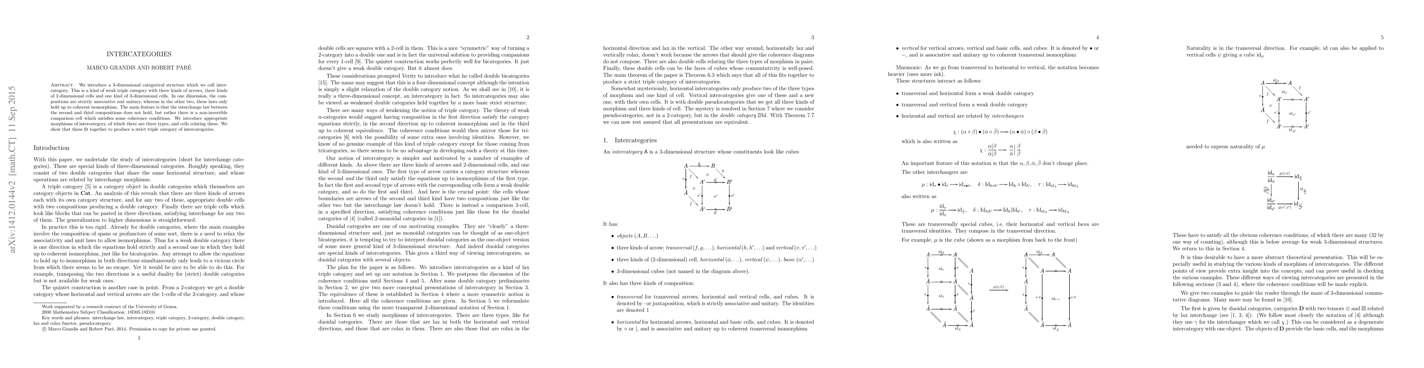 We introduce a 3-dimensional categorical structure which we call intercategory. This is a kind of weak triple category with three kinds of arrows, three kinds of 2-dimensional cells and one kind of 3-dimensional cells. In one dimension, the compositions are strictly associative and unitary, whereas in the other two, these laws only hold up to coherent isomorphism. The main feature is that the interchange law between the second and third compositions does not hold, but rather there is a non invertible comparison cell which satisfies some coherence conditions. We introduce appropriate morphisms of intercategory, of which there are three types, and cells relating these. We show that these fit together to produce a strict triple category of intercategories.