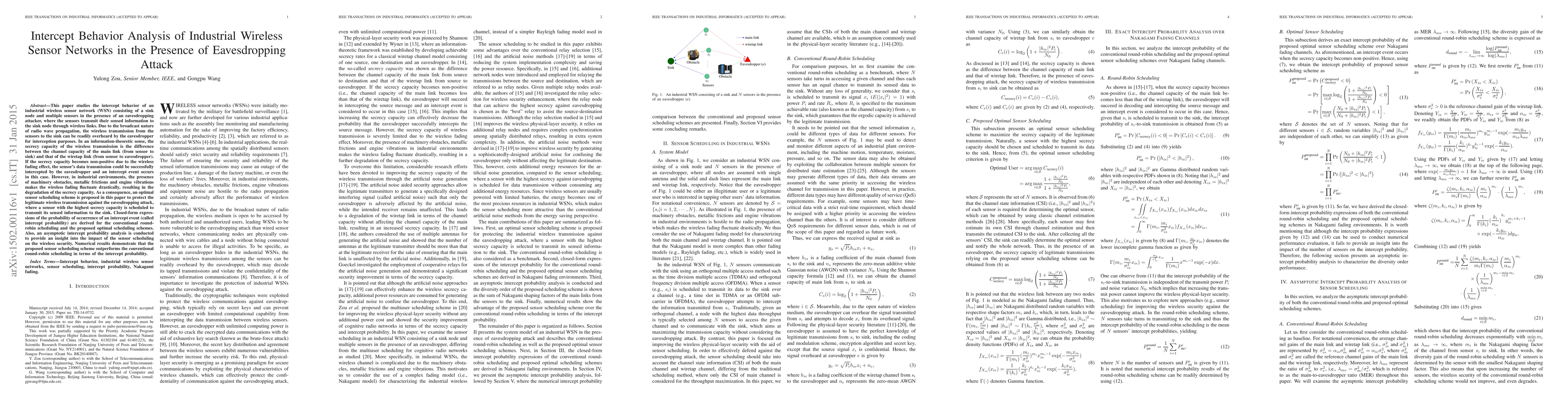 This paper studies the intercept behavior of an industrial wireless sensor network (WSN) consisting of a sink node and multiple sensors in the presence of an eavesdropping attacker, where the sensors transmit their sensed information to the sink node through wireless links. Due to the broadcast nature of radio wave propagation, the wireless transmission from the sensors to the sink can be readily overheard by the eavesdropper for interception purposes. In an information-theoretic sense, the secrecy capacity of the wireless transmission is the difference between the channel capacity of the main link (from sensor to sink) and that of the wiretap link (from sensor to eavesdropper). If the secrecy capacity becomes non-positive due to the wireless fading effect, the sensor's data transmission could be successfully intercepted by the eavesdropper and an intercept event occurs in this case. However, in industrial environments, the presence of machinery obstacles, metallic frictions and engine vibrations makes the wireless fading fluctuate drastically, resulting in the degradation of the secrecy capacity. As a consequence, an optimal sensor scheduling scheme is proposed in this paper to protect the legitimate wireless transmission against the eavesdropping attack, where a sensor with the highest secrecy capacity is scheduled to transmit its sensed information to the sink. Closed-form expressions of the probability of occurrence of an intercept event (called intercept probability) are derived for the conventional round-robin scheduling and the proposed optimal scheduling schemes. Also, an asymptotic intercept probability analysis is conducted to provide an insight into the impact of the sensor scheduling on the wireless security. Numerical results demonstrate that the proposed sensor scheduling scheme outperforms the conventional round-robin scheduling in terms of the intercept probability.