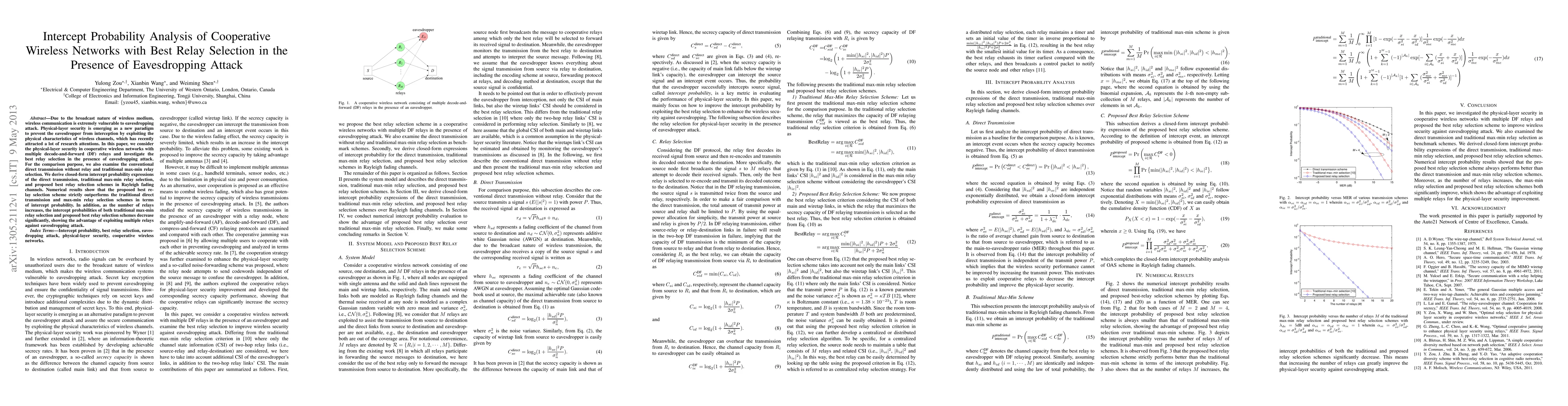 This paper investigates physical-layer security in cooperative wireless networks with multiple decode-and-forward relays, focusing on the best relay selection to mitigate eavesdropping attacks. The study derives closed-form intercept probability expressions for direct transmission, traditional max-min relay selection, and the proposed best relay selection, demonstrating superior performance of the latter.