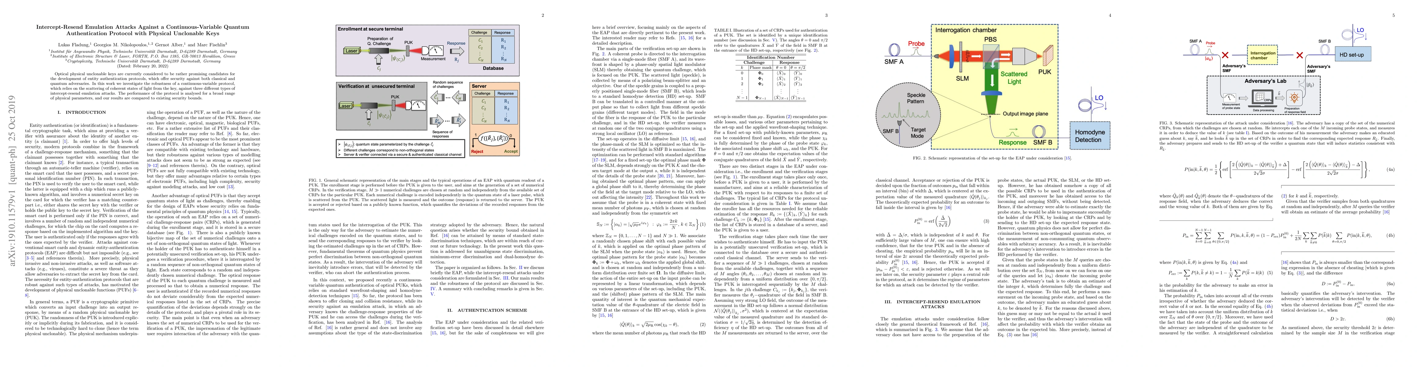 This paper examines the security of a continuous-variable quantum authentication protocol using optical physical unclonable keys against intercept-resend emulation attacks. The study analyzes the protocol's performance under various physical conditions and compares the results to existing security benchmarks.