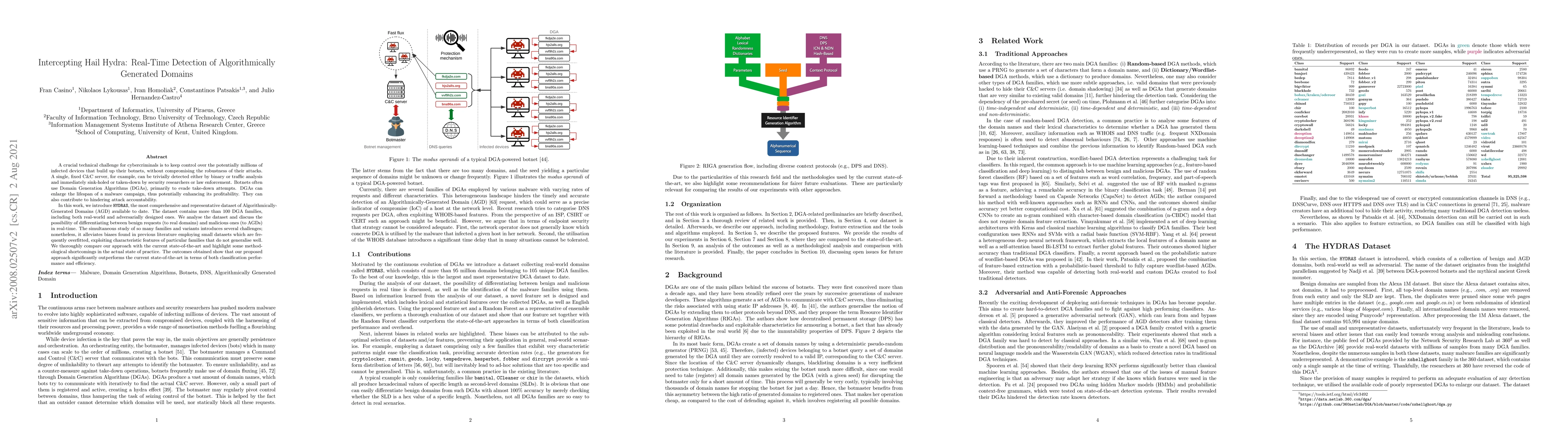 A new dataset called HYDRAS has been created to detect algorithmically generated domains used in botnets, which can evade detection, and a real-time classification approach outperforms existing methods.