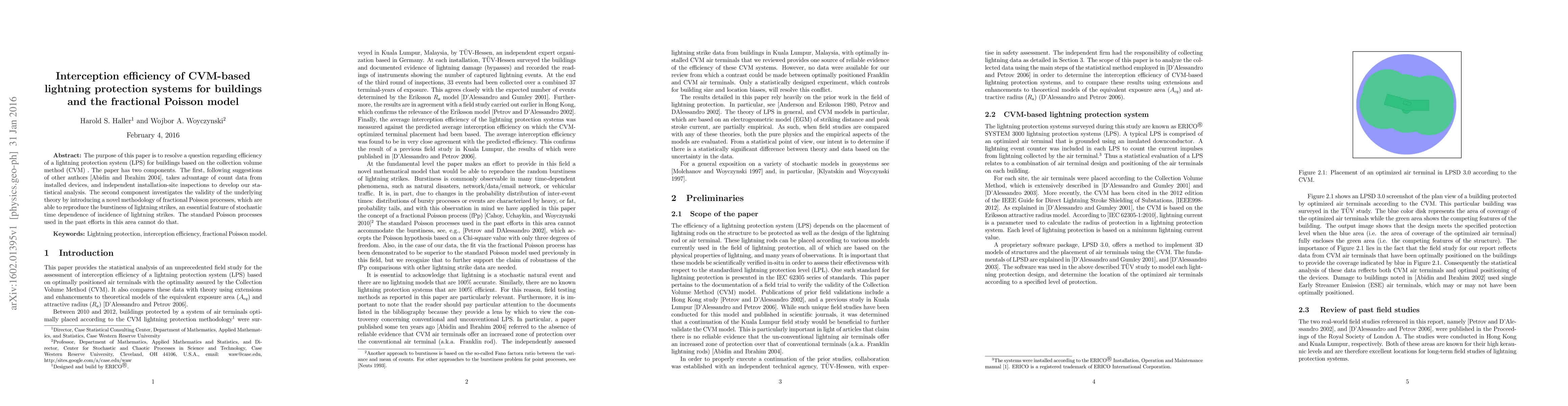 The purpose of this paper is to resolve a question regarding efficiency of a lightning protection system (LPS) for buildings based on the collection volume method (CVM) . The paper has two components. The first, following suggestions of other authors [Abidin and Ibrahim 2004], takes advantage of count data from installed devices, and independent installation-site inspections to develop our statistical analysis. The second component investigates the validity of the underlying theory by introducing a novel methodology of fractional Poisson processes, which are able to reproduce the burstiness of lightning strikes, an essential feature of stochastic time dependence of incidence of lightning strikes. The standard Poisson processes used in the past efforts in this area cannot do that.