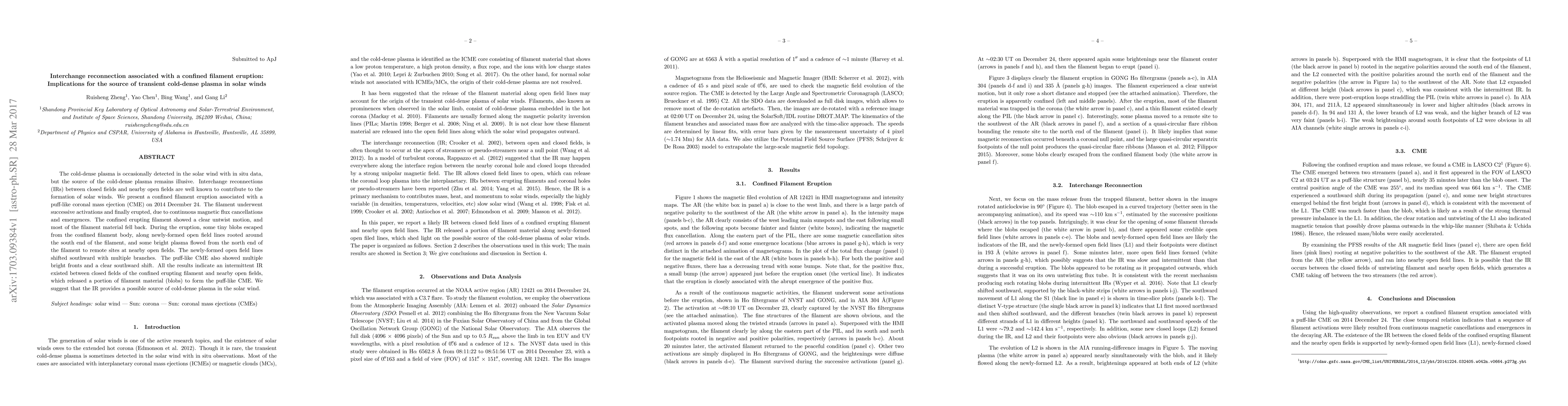 The paper presents an analysis of a confined filament eruption on December 24, 2014, linked to a puff-like coronal mass ejection (CME). The authors suggest that interchange reconnections (IRs) between closed fields of the erupting filament and nearby open fields released cold-dense plasma blobs, forming the CME. This implies that IRs could be a source of cold-dense plasma in solar winds.