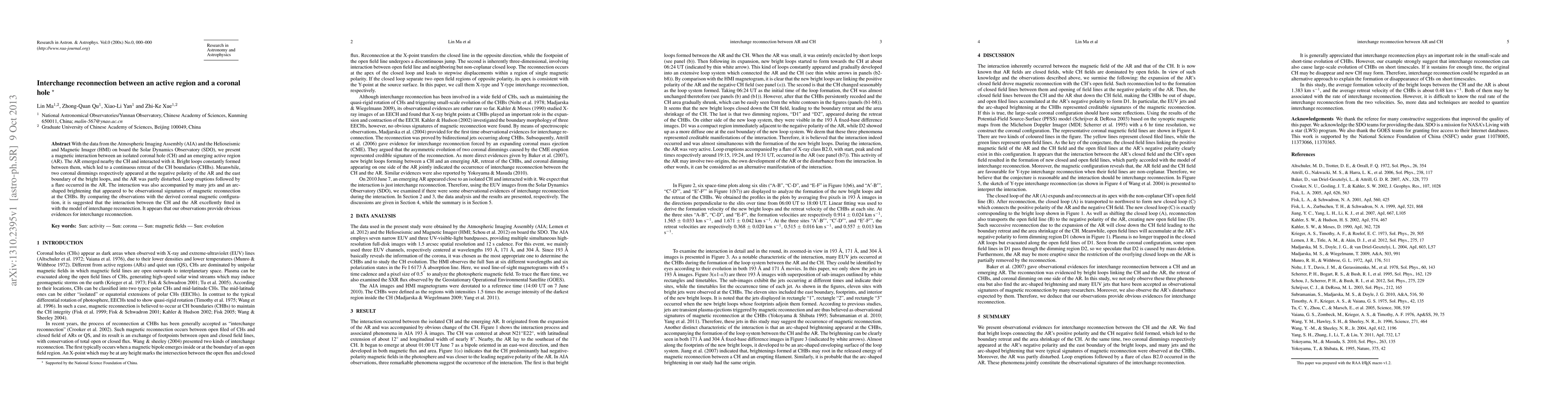 This paper investigates the magnetic interaction between an emerging active region and a coronal hole using data from the SDO's AIA and HMI. Observations show bright loops forming and CH boundaries retreating, indicating interchange reconnection, supported by coronal dimmings, loop eruptions, and jets.