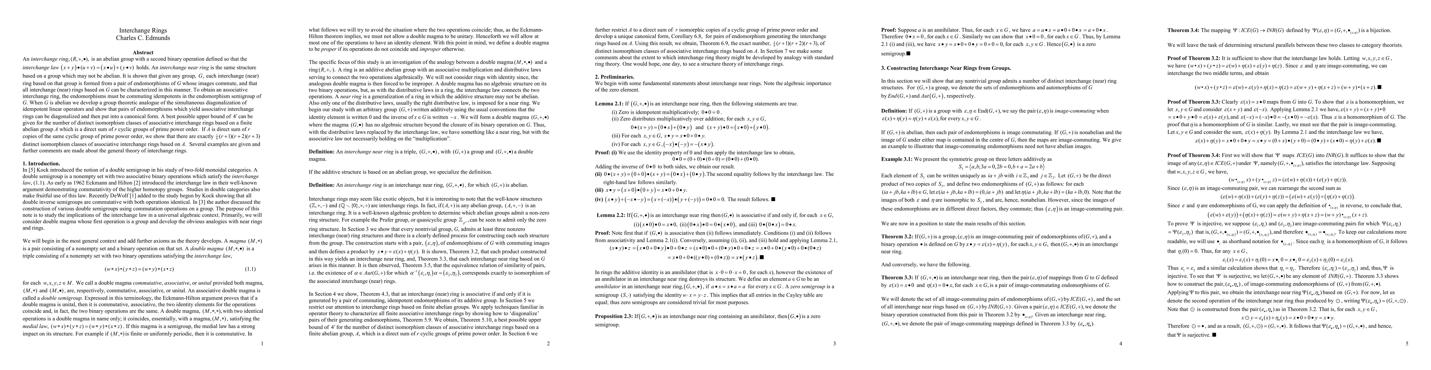 An interchange ring,(R,+,*)is an abelian group with a second binary operation defined so that the interchange law (x+y)*(u+v)=(x*u)+(y*v)holds. An interchange near ring is the same structure based on a group which may not be abelian. It is shown that given any group,G,each interchange(near)ring based on that group is formed from a pair of endomorphisms of G whose images commute, and that all interchange (near)rings based on G can be characterized in this manner. To obtain an associative interchange ring, the endomorphisms must be commuting idempotents in the endomorphism semigroup of G. When G is abelian we develop a group theoretic analogue of the simultaneous diagonalization of idempotent linear operators and show that pairs of endomorphisms which yield associative interchange rings can be diagonalized and then put into a canonical form. A best possible upper bound of 4^r can be given for the number of distinct isomorphism classes of associative interchange rings based on a finite abelian group A which is a direct sum of r cyclic groups of prime power order. If A is direct sum of r copies of the same cyclic group of prime power order, we show that there are exactly (r+1)(r+2)(r+3)/6 distinct isomorphism classes of associative interchange rings based on A. Several examples are given and further comments are made about the general theory of interchange rings.