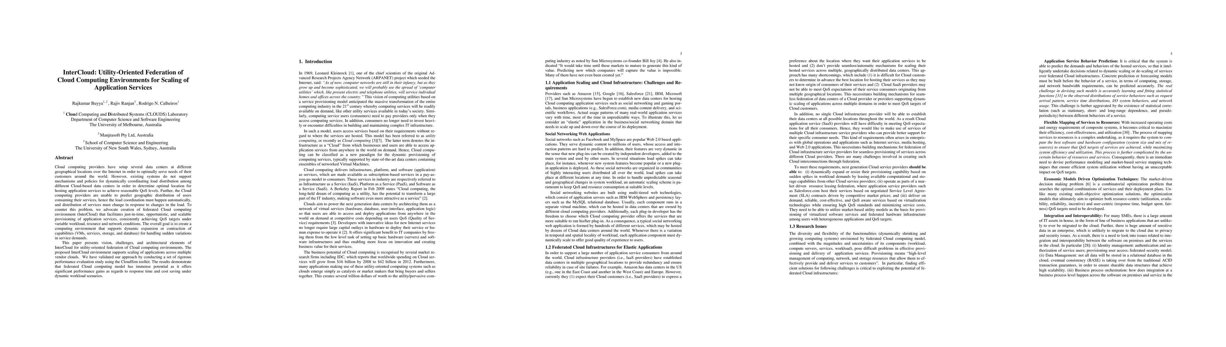 The paper proposes InterCloud, a federated cloud computing environment aimed at dynamically coordinating load distribution among multiple cloud-based data centers to achieve optimal service quality and cost efficiency. Performance evaluation using CloudSim shows significant gains in response time and cost savings under variable workloads.