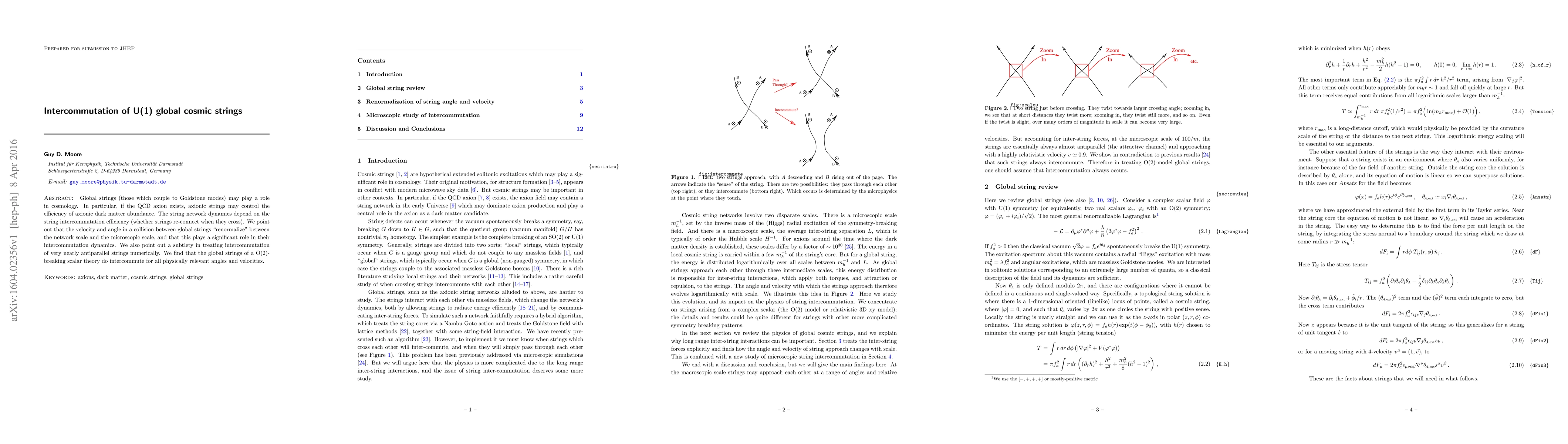 This paper investigates the intercommutation dynamics of U(1) global cosmic strings, which are significant in the context of axion physics and dark matter abundance. The study reveals that the intercommutation efficiency is influenced by the renormalization of collision velocities and angles, and it concludes that these strings can intercommute across all relevant angles and velocities.
