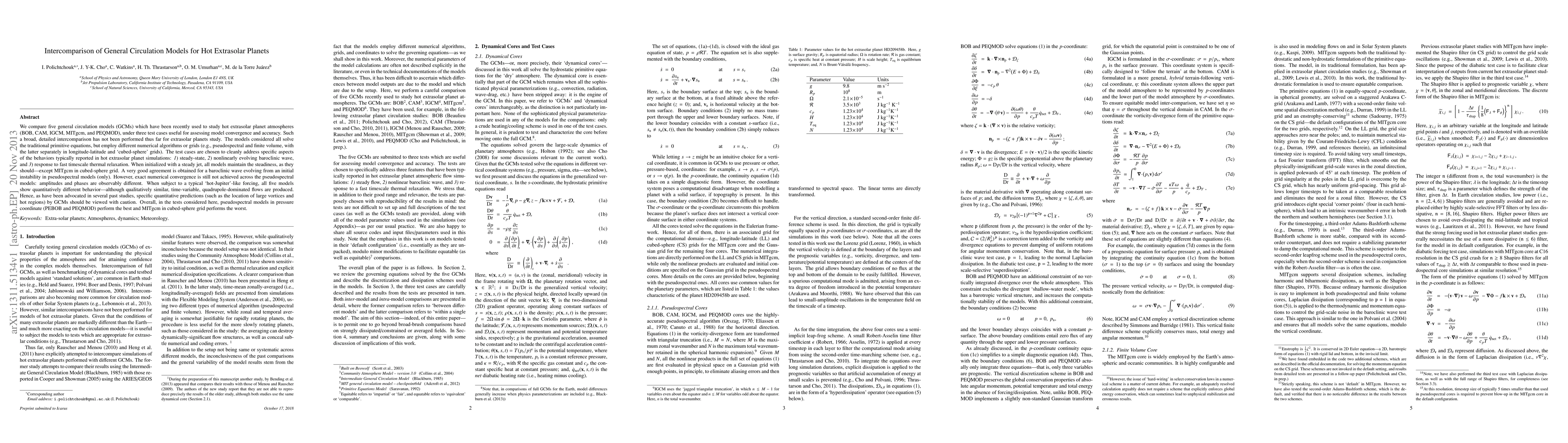 Five General Circulation Models (GCMs) - BOB, CAM, IGCM, MITgcm, and PEQMOD - were compared using three test cases to assess model convergence and accuracy for hot extrasolar planet atmospheres.