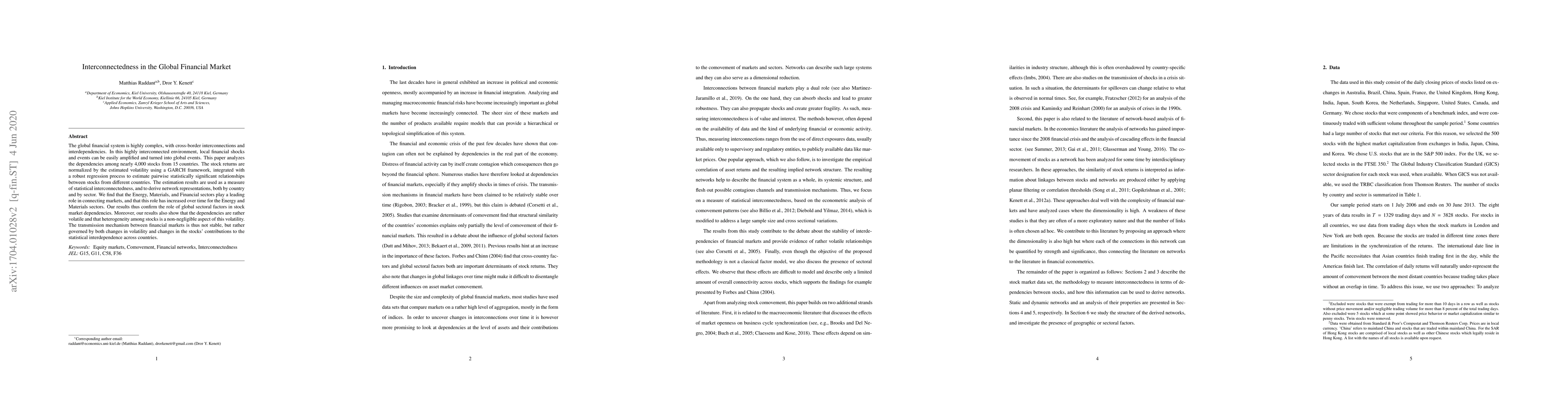 The global financial system is highly complex, with cross-border interconnections and interdependencies. In this highly interconnected environment, local financial shocks and events can be easily amplified and turned into global events. This paper analyzes the dependencies among nearly 4,000 stocks from 15 countries. The returns are normalized by the estimated volatility using a GARCH model and a robust regression process estimates pairwise statistical relationships between stocks from different markets. The estimation results are used as a measure of statistical interconnectedness, and to derive network representations, both by country and by sector. The results show that countries like the United States and Germany are in the core of the global stock market. The energy, materials, and financial sectors play an important role in connecting markets, and this role has increased over time for the energy and materials sectors. Our results confirm the role of global sectoral factors in stock market dependence. Moreover, our results show that the dependencies are rather volatile and that heterogeneity among stocks is a non-negligible aspect of this volatility.