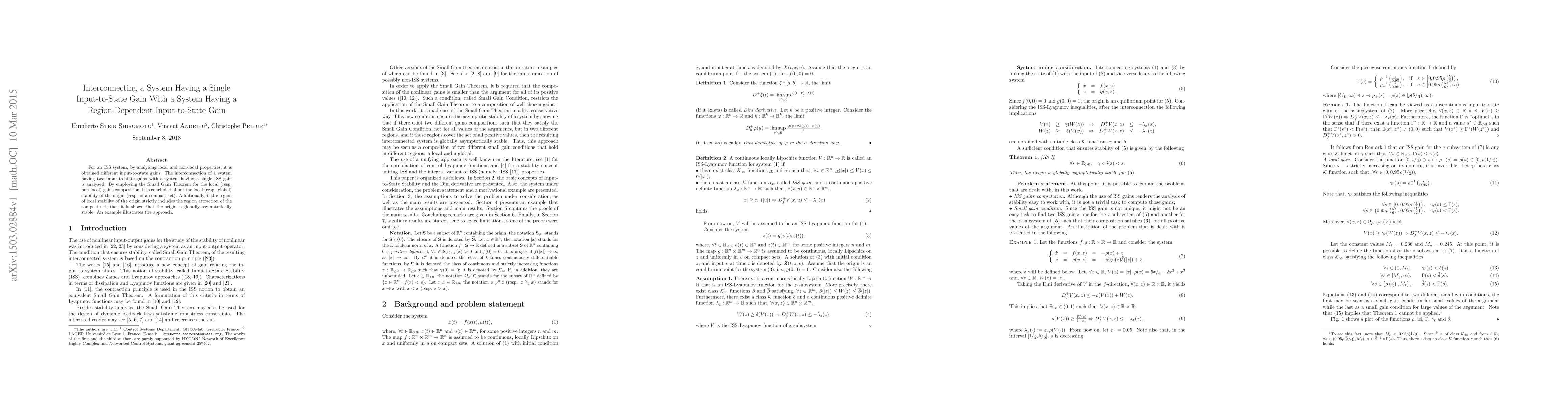 For an ISS system, by analyzing local and non-local properties, it is obtained different input-to-state gains. The interconnection of a system having two input-to-state gains with a system having a single ISS gain is analyzed. By employing the Small Gain Theorem for the local (resp. non-local) gains composition, it is concluded about the local (resp. global) stability of the origin (resp. of a compact set). Additionally, if the region of local stability of the origin strictly includes the region attraction of the compact set, then it is shown that the origin is globally asymptotically stable. An example illustrates the approach.