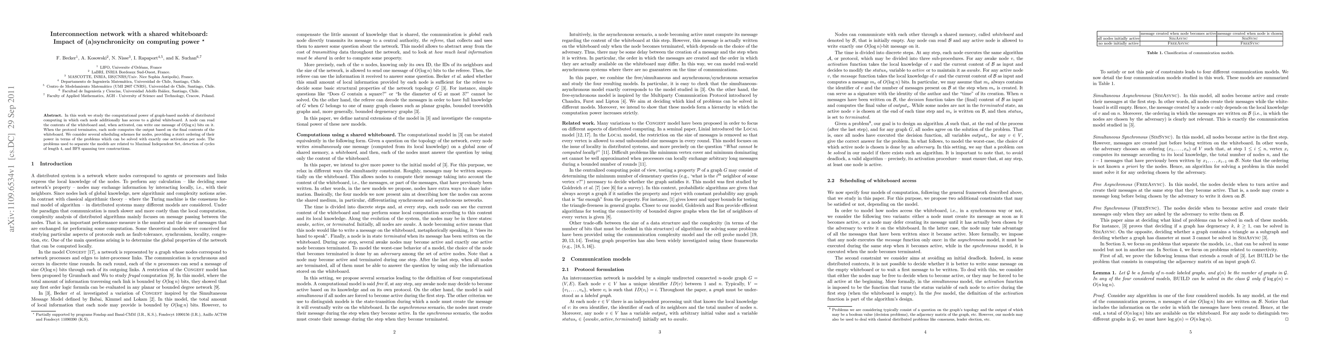 In this work we study the computational power of graph-based models of distributed computing in which each node additionally has access to a global whiteboard. A node can read the contents of the whiteboard and, when activated, can write one message of O(log n) bits on it. When the protocol terminates, each node computes the output based on the final contents of the whiteboard. We consider several scheduling schemes for nodes, providing a strict ordering of their power in terms of the problems which can be solved with exactly one activation per node. The problems used to separate the models are related to Maximal Independent Set, detection of cycles of length 4, and BFS spanning tree constructions.