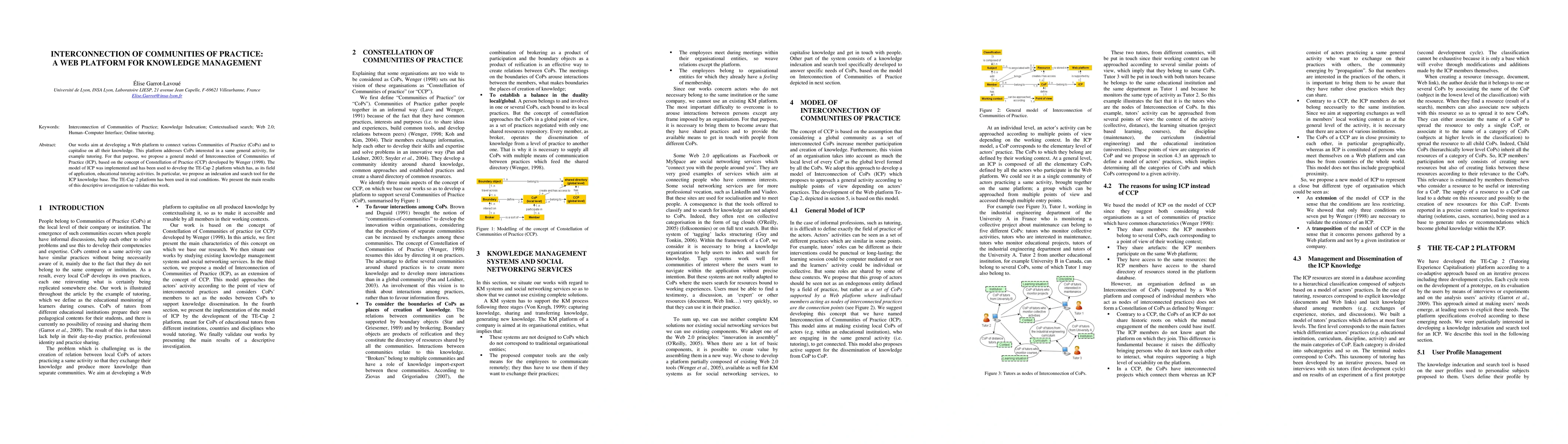 Our works aim at developing a Web platform to connect various Communities of Practice (CoPs) and to capitalise on all their knowledge. This platform addresses CoPs interested in a same general activity, for example tutoring. For that purpose, we propose a general model of Interconnection of Communities of Practice (ICP), based on the concept of Constellation of Practice (CCP) developed by Wenger (1998). The model of ICP was implemented and has been used to develop the TE-Cap 2 platform which has, as its field of application, educational tutoring activities. In particular, we propose an indexation and search tool for the ICP knowledge base. The TE-Cap 2 platform has been used in real conditions. We present the main results of this descriptive investigation to validate this work.