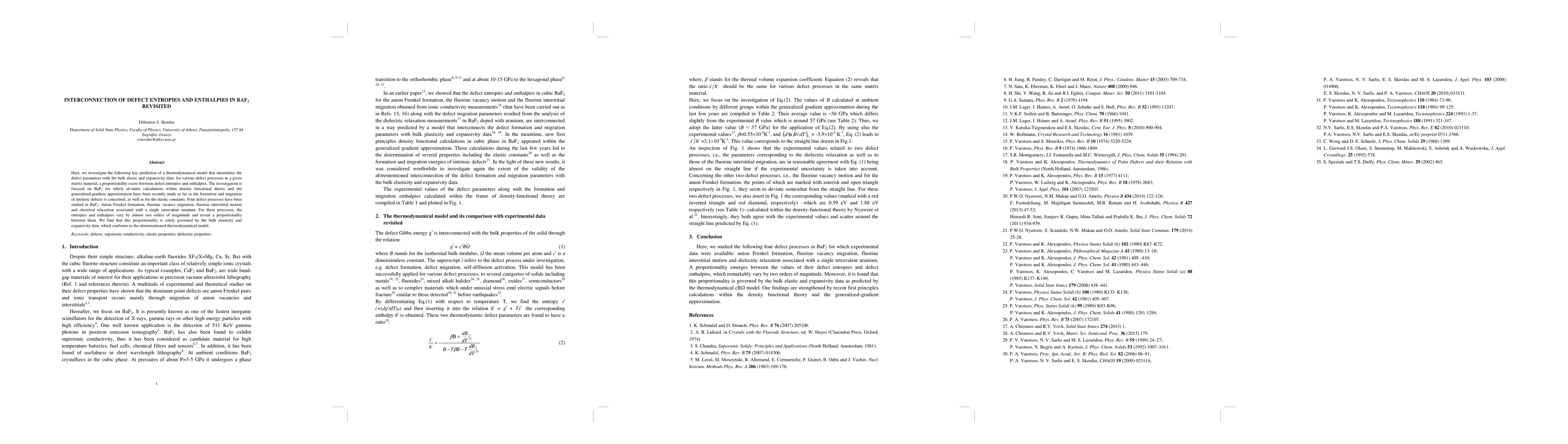 Here, we investigate the following key prediction of a thermodynamical model that interrelates the defect parameters with the bulk elastic and expansivity data: for various defect processes in a given matrix material, a proportionality exists between defect entropies and enthalpies. The investigation is focused on BaF2 for which ab-initio calculations within density functional theory and the generalized-gradient approximation have been recently made as far as the formation and migration of intrinsic defects is concerned, as well as for the elastic constants. Four defect processes have been studied in BaF$_2$: Anion Frenkel formation, fluorine vacancy migration, fluorine interstitial motion and electrical relaxation associated with a single tetravalent uranium. For these processes, the entropies and enthalpies vary by almost two orders of magnitude and reveal a proportionality between them. We find that this proportionality is solely governed by the bulk elasticity and expansivity data, which conforms to the aforementioned thermodynamical model.