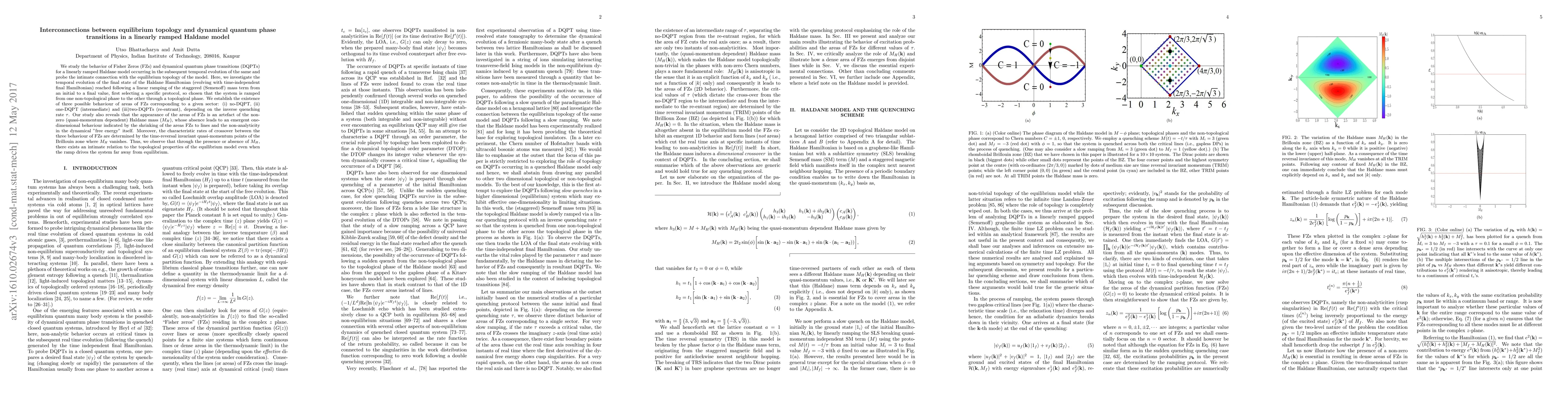 We study the behavior of Fisher Zeros (FZs) and dynamical quantum phase transitions (DQPTs) for a linearly ramped Haldane model occurring in the subsequent temporal evolution of the same and probe the intimate connection with the equilibrium topology of the model}. Here, we investigate the temporal evolution of the final state of the Haldane Hamiltonian (evolving with time-independent final Hamiltonian) reached following a linear ramping of the staggered (Semenoff) mass term from an initial to a final value, {first selecting a specific protocol}, so chosen that the system is ramped from one non-topological phase to the other through a topological phase. {We establish the existence of three possible behaviour of areas of FZs corresponding to a given sector: (i) no-DQPT, (ii) one-DQPT (intermediate) and (iii)two-DQPTs (re-entrant), depending on the inverse quenching rate $\tau$. Our study also reveals that the appearance of the areas of FZs is an artefact of the non-zero (quasi-momentum dependent) Haldane mass ($M_H$), whose absence leads to an emergent one-dimensional behaviour indicated by the shrinking of the areas FZs to lines and the non-analyticity in the dynamical "free energy" itself. Moreover, the characteristic rates of crossover between the three behaviour of FZs are determined by the time-reversal invariant quasi-momentum points of the Brillouin zone where $M_H$ vanishes. Thus, we observe that through the presence or absence of $M_H$, there exists an intimate relation to the topological properties of the equilibrium model even when the ramp drives the system far away from equilibrium.