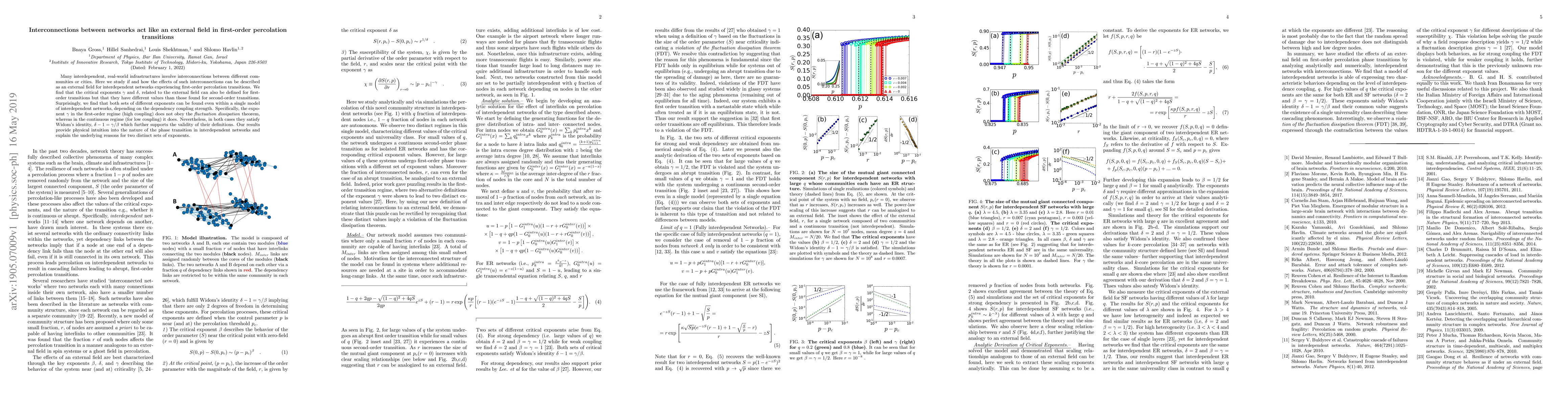 Many interdependent, real-world infrastructures involve interconnections between different communities or cities. Here we study if and how the effects of such interconnections can be described as an external field for interdependent networks experiencing first-order percolation transitions. We find that the critical exponents $\gamma$ and $\delta$, related to the external field can also be defined for first-order transitions but that they have different values than those found for second-order transitions. Surprisingly, we find that both sets of different exponents can be found even within a single model of interdependent networks, depending on the dependency coupling strength. Specifically, the exponent $\gamma$ in the first-order regime (high coupling) does not obey the fluctuation dissipation theorem, whereas in the continuous regime (for low coupling) it does. Nevertheless, in both cases they satisfy Widom's identity, $\delta - 1 = \gamma / \beta$ which further supports the validity of their definitions. Our results provide physical intuition into the nature of the phase transition in interdependent networks and explain the underlying reasons for two distinct sets of exponents.