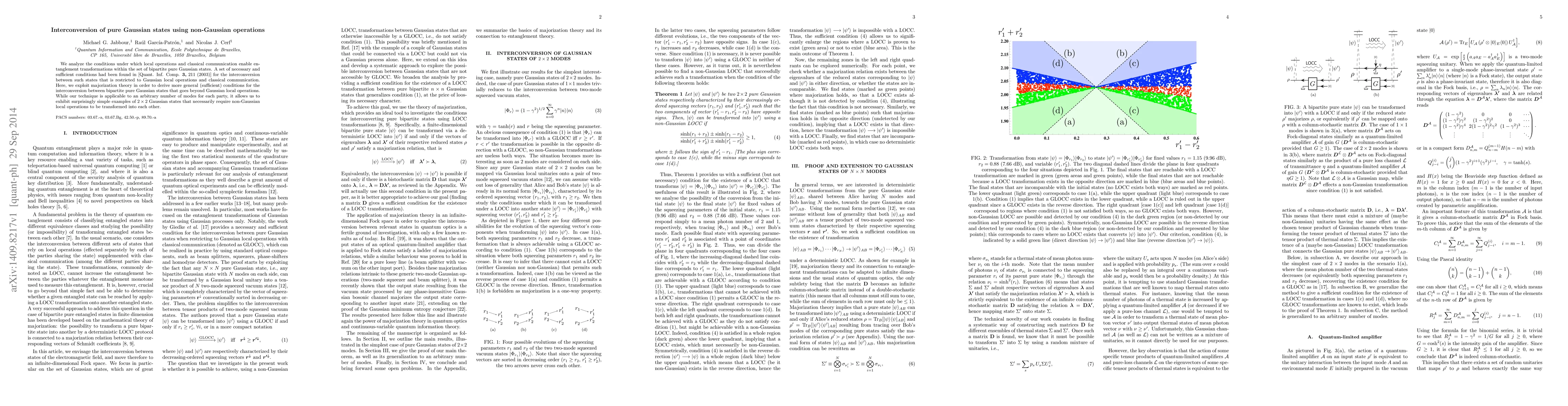 This paper explores the conditions under which non-Gaussian operations, alongside classical communication, allow for the transformation of bipartite pure Gaussian states. It employs majorization theory to derive more general sufficient conditions for such transformations, revealing simple examples of 2 x 2 Gaussian states that require non-Gaussian operations for interconversion.