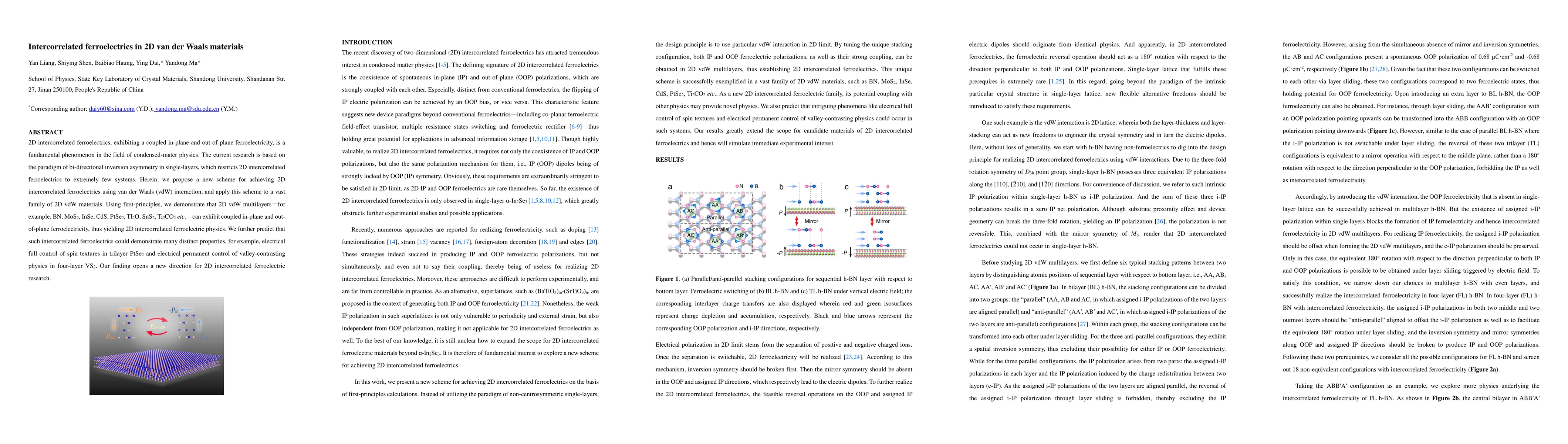 This research proposes a new method using van der Waals interaction to achieve 2D intercorrelated ferroelectrics in a wide range of 2D materials, including BN, MoS2, InSe, CdS, PtSe2, TI2O, SnS2, Ti2CO2. The study predicts these materials could display coupled in-plane and out-of-plane ferroelectricity, leading to unique properties like electrical control of spin textures and valley-contrasting physics, opening a new avenue in 2D ferroelectric research.
