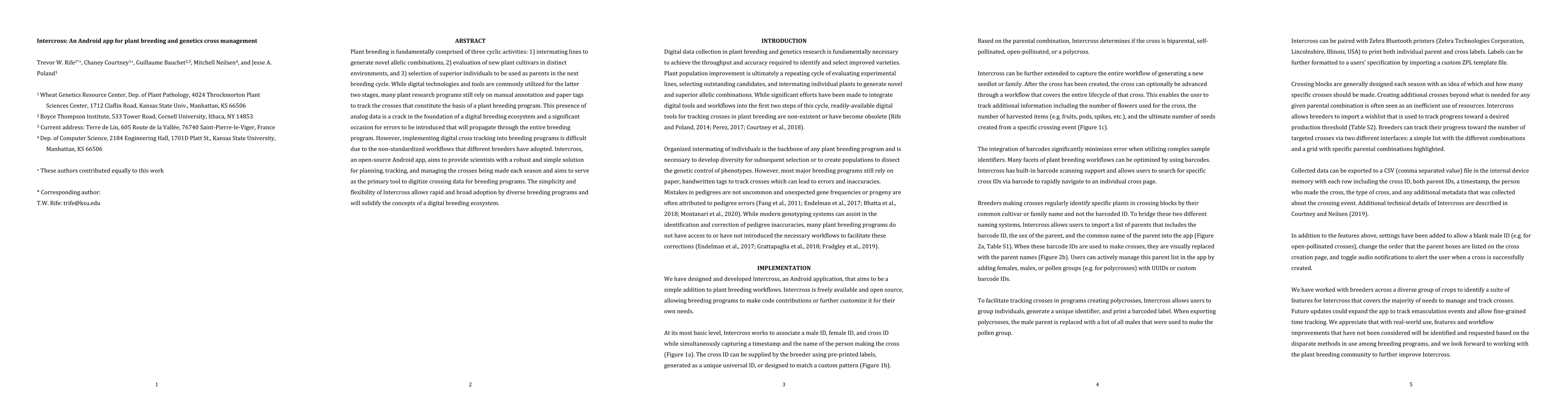 Intercross is an open-source Android app designed for planning, tracking, and managing plant breeding crosses. It determines cross types (biparental, self-pollinated, open-pollinated, or polycross) based on parental combinations and tracks additional information like flowers used, harvested items, and seeds created.