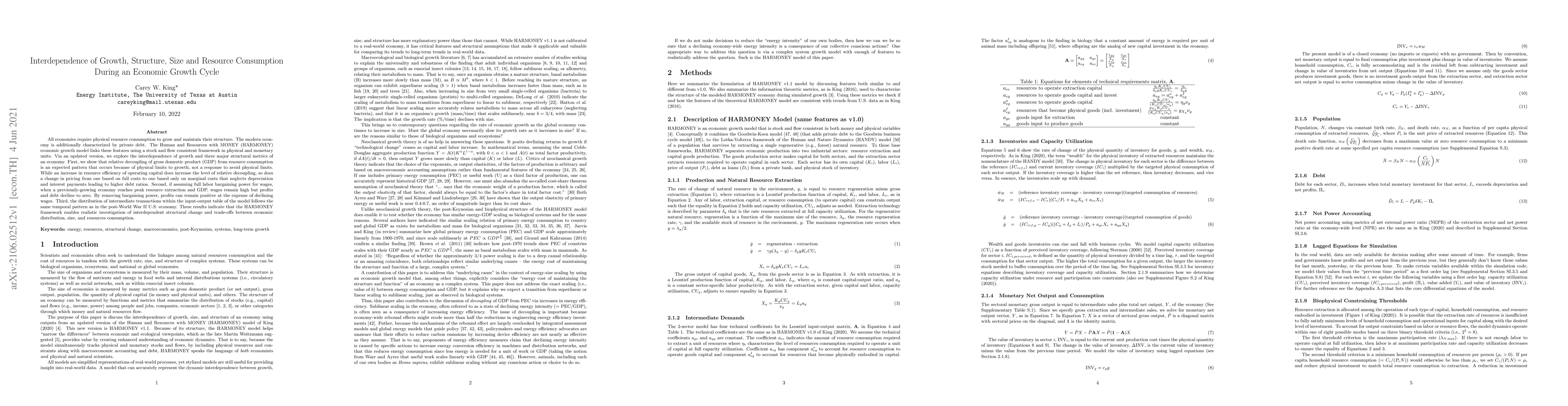 All economies require physical resource consumption to grow and maintain their structure. The modern economy is additionally characterized by private debt. The Human and Resources with MONEY (HARMONEY) economic growth model links these features using a stock and flow consistent framework in physical and monetary units. Via an updated version, we explore the interdependence of growth and three major structural metrics of an economy. First, we show that relative decoupling of gross domestic product (GDP) from resource consumption is an expected pattern that occurs because of physical limits to growth, not a response to avoid physical limits. While an increase in resource efficiency of operating capital does increase the level of relative decoupling, so does a change in pricing from one based on full costs to one based only on marginal costs that neglects depreciation and interest payments leading to higher debt ratios. Second, if assuming full labor bargaining power for wages, when a previously-growing economy reaches peak resource extraction and GDP, wages remain high but profits and debt decline to zero. By removing bargaining power, profits can remain positive at the expense of declining wages. Third, the distribution of intermediate transactions within the input-output table of the model follows the same temporal pattern as in the post-World War II U.S. economy. These results indicate that the HARMONEY framework enables realistic investigation of interdependent structural change and trade-offs between economic distribution, size, and resources consumption.