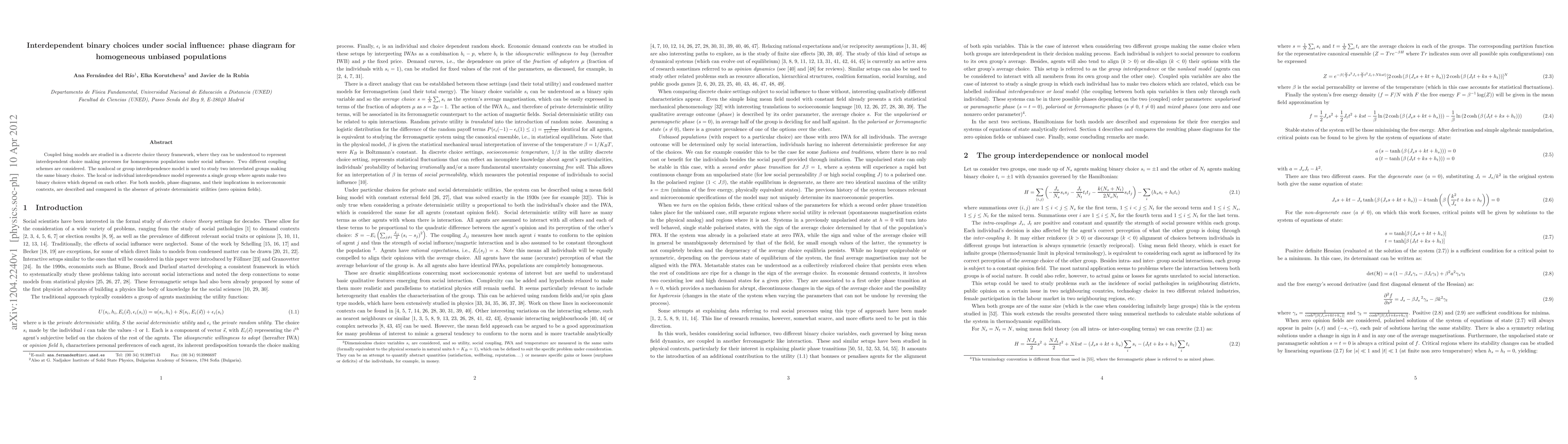 Coupled Ising models are studied in a discrete choice theory framework, where they can be understood to represent interdependent choice making processes for homogeneous populations under social influence. Two different coupling schemes are considered. The nonlocal or group interdependence model is used to study two interrelated groups making the same binary choice. The local or individual interdependence model represents a single group where agents make two binary choices which depend on each other. For both models, phase diagrams, and their implications in socioeconomic contexts, are described and compared in the absence of private deterministic utilities (zero opinion fields).