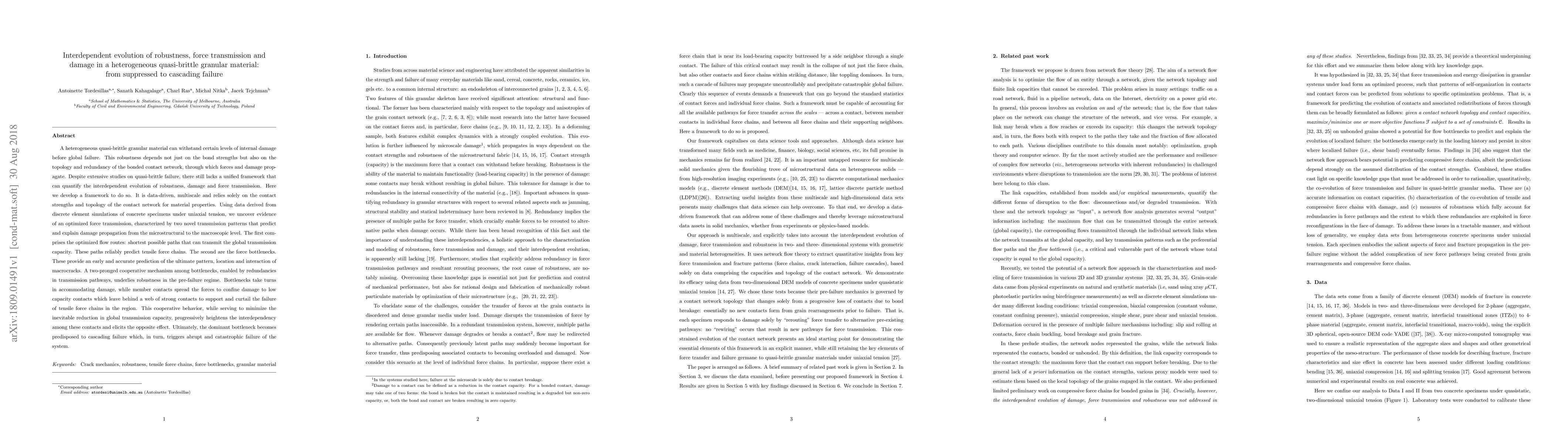 A heterogeneous quasi-brittle granular material can withstand certain levels of internal damage before global failure. This robustness depends not just on the bond strengths but also on the topology and redundancy of the bonded contact network, through which forces and damage propagate. Despite extensive studies on quasi-brittle failure, there still lacks a unified framework that can quantify the interdependent evolution of robustness, damage and force transmission. Here we develop a framework to do so. It is data-driven, multiscale and relies solely on the contact strengths and topology of the contact network for material properties. Using data derived from discrete element simulations of concrete specimens under uniaxial tension, we uncover evidence of an optimized force transmission, characterized by two novel transmission patterns that predict and explain damage propagation from the microstructural to the macroscopic level. The first comprises the optimized flow routes: shortest possible paths that can transmit the global transmission capacity. These paths reliably predict tensile force chains. The second are the force bottlenecks. These provide an early and accurate prediction of the ultimate pattern, location and interaction of macrocracks. A two-pronged cooperative mechanism among bottlenecks, enabled by redundancies in transmission pathways, underlies robustness in the pre-failure regime. Bottlenecks take turns in accommodating damage, while member contacts spread the forces to confine damage to low capacity contacts which leave behind a web of strong contacts to support and curtail the failure of tensile force chains in the region. This cooperative behavior, while serving to minimize the inevitable reduction in global transmission capacity, progressively heightens the interdependency among these contacts and elicits the opposite effect.