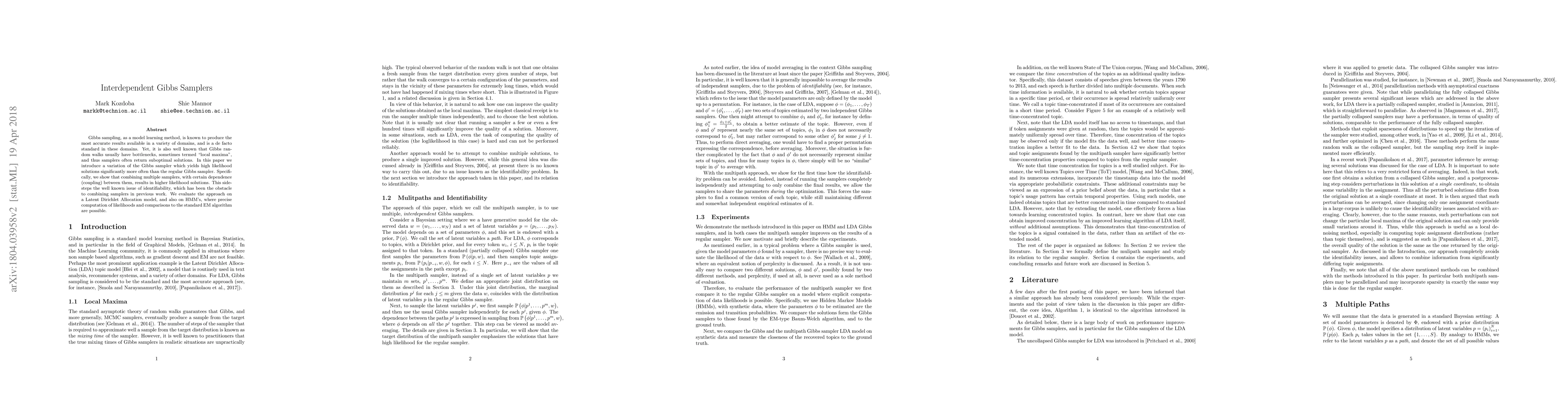This paper proposes an interdependent Gibbs sampler that combines multiple Gibbs samplers with coupling to achieve higher likelihood solutions more frequently than traditional Gibbs sampling. The method addresses the issue of identifiability, allowing for effective combination of samplers, and is demonstrated on Latent Dirichlet Allocation and HMM models.