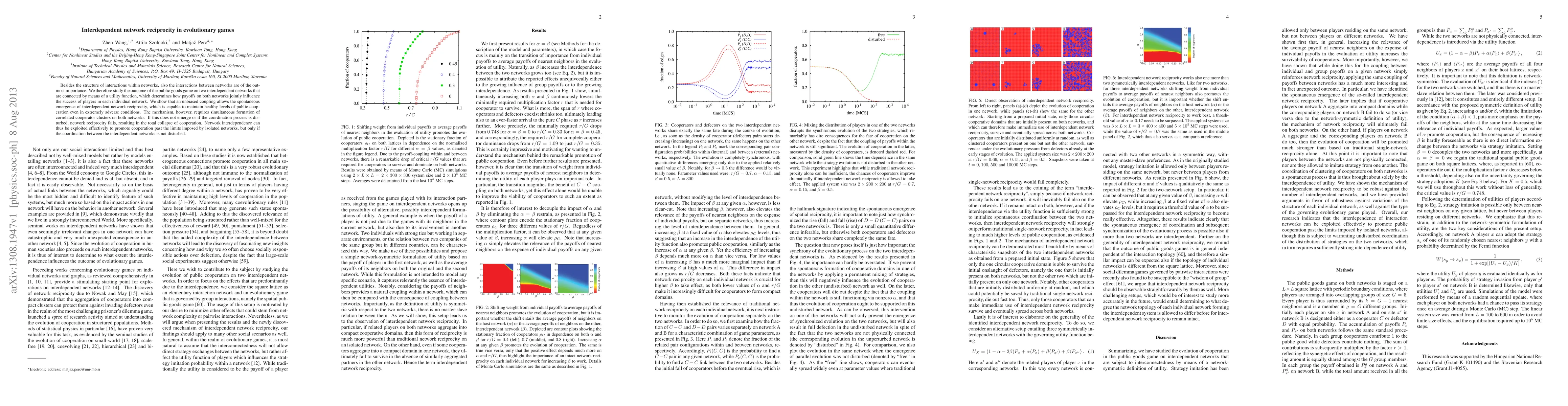 This study explores how interdependent networks can enhance cooperation through reciprocity in evolutionary games, specifically using the public goods game. It finds that an unbiased coupling between networks can foster cooperation, but only if correlated cooperator clusters form simultaneously on both networks, otherwise cooperation collapses.