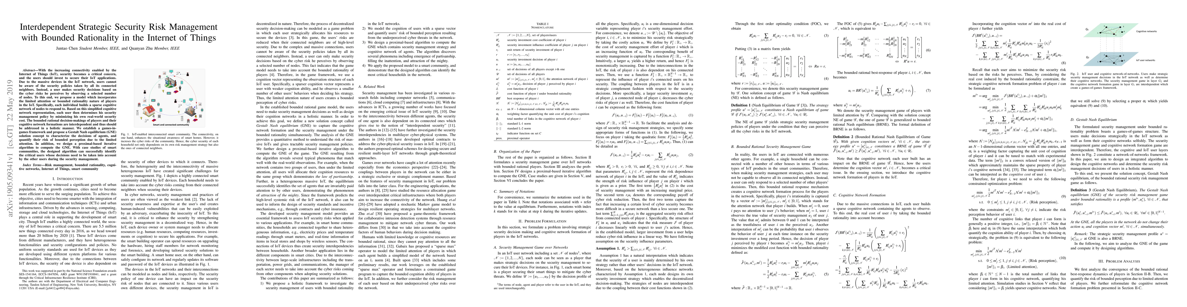 With the increasing connectivity enabled by the Internet of Things (IoT), security becomes a critical concern, and the users should invest to secure their IoT applications. Due to the massive devices in the IoT network, users cannot be aware of the security policies taken by all its connected neighbors. Instead, a user makes security decisions based on the cyber risks he perceives by observing a selected number of nodes. To this end, we propose a model which incorporates the limited attention or bounded rationality nature of players in the IoT. Specifically, each individual builds a sparse cognitive network of nodes to respond to. Based on this simplified cognitive network representation, each user then determines his security management policy by minimizing his own real-world security cost. The bounded rational decision-makings of players and their cognitive network formations are interdependent and thus should be addressed in a holistic manner. We establish a games-in-games framework and propose a Gestalt Nash equilibrium (GNE) solution concept to characterize the decisions of agents, and quantify their risk of bounded perception due to the limited attention. In addition, we design a proximal-based iterative algorithm to compute the GNE. With case studies of smart communities, the designed algorithm can successfully identify the critical users whose decisions need to be taken into account by the other users during the security management.