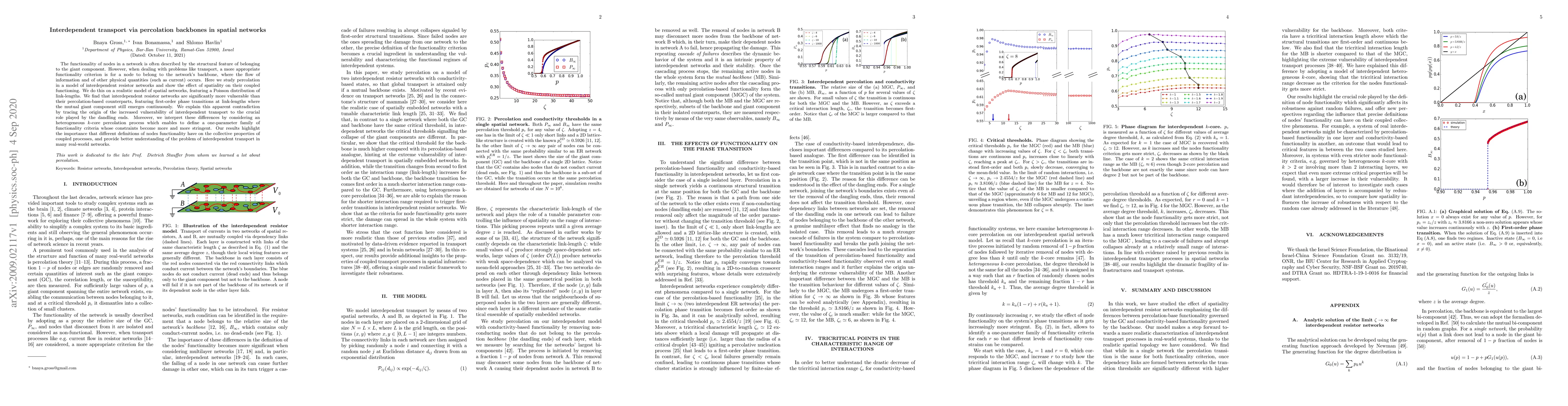 The functionality of nodes in a network is often described by the structural feature of belonging to the giant component. However, when dealing with problems like transport, a more appropriate functionality criterion is for a node to belong to the network's backbone, where the flow of information and of other physical quantities (such as current) occurs. Here we study percolation in a model of interdependent resistor networks and show the effect of spatiality on their coupled functioning. We do this on a realistic model of spatial networks, featuring a Poisson distribution of link-lengths. We find that interdependent resistor networks are significantly more vulnerable than their percolation-based counterparts, featuring first-order phase transitions at link-lengths where the mutual giant component still emerges continuously. We explain this apparent contradiction by tracing the origin of the increased vulnerability of interdependent transport to the crucial role played by the dandling ends. Moreover, we interpret these differences by considering an heterogeneous $k$-core percolation process which enables to define a one-parameter family of functionality criteria whose constraints become more and more stringent. Our results highlight the importance that different definitions of nodes functionality have on the collective properties of coupled processes, and provide better understanding of the problem of interdependent transport in many real-world networks.