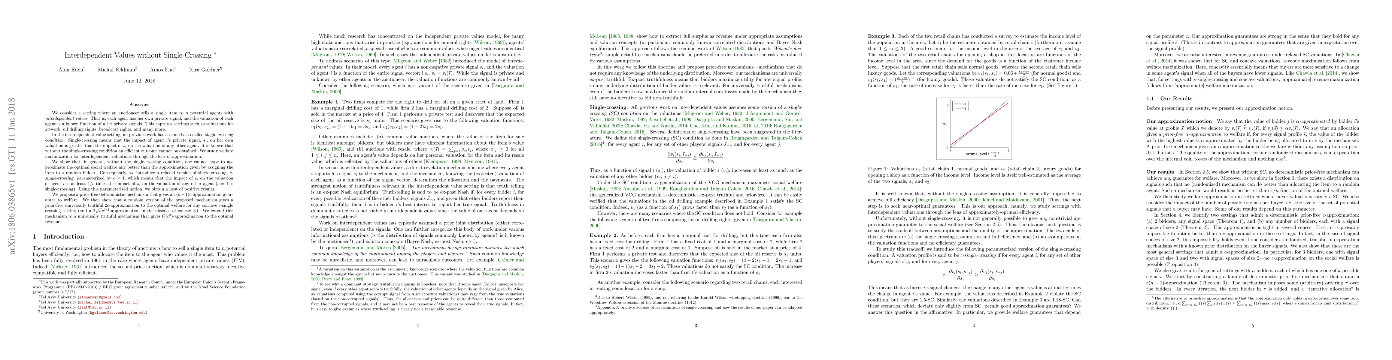 This paper explores auction mechanisms for selling a single item to agents with interdependent values, where previous models relied on the single-crossing condition. It demonstrates that without this condition, optimal social welfare cannot be approximated well, but introduces a relaxed $c$-single-crossing notion to achieve positive results, proposing a mechanism that provides strong approximation guarantees for welfare and revenue.