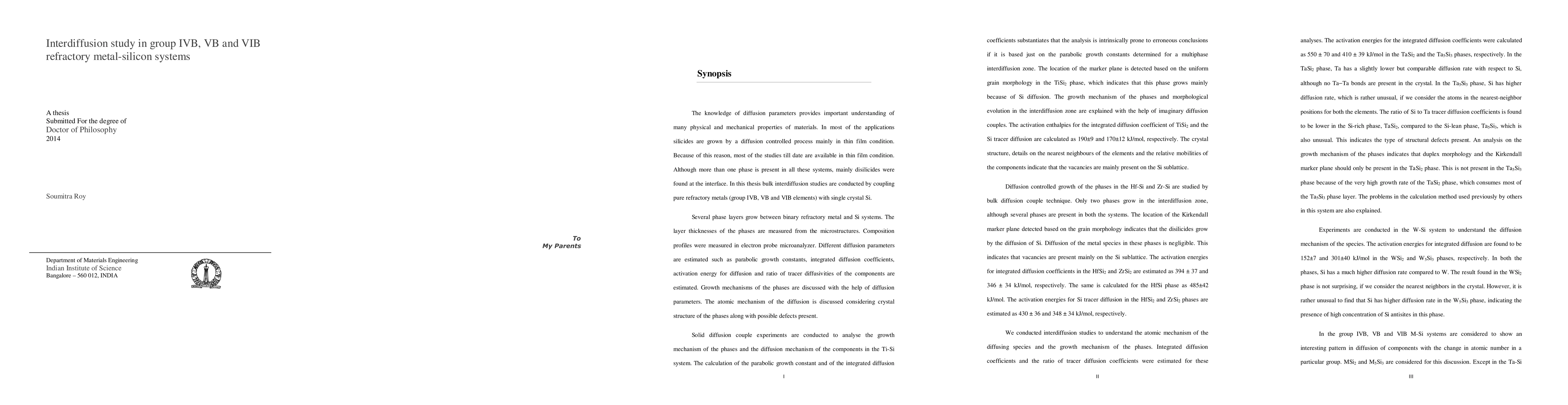 The solid state interdiffusion in refractory metals and single crystal Si are studied in details by diffusion couple technique. The wide range of application and importance of silicides in various devices are the motivation for these studies. The refractory metals which are considered and compared in these M/Si systems (M = metal) are group IVB elements Ti, Zr and Hf, group VB elements V, Nb and Ta, group VIB elements Cr, Mo and W. Out of these systems, the Ti, Zr, Hf, Ta and W M-Si systems have been studied in this thesis. The results of V, Nb and Mo systems, which were studied before in our group, are compared with the result of present study and a systematic pattern in diffusion behavior is found with increasing atomic number of the elements, group-wise in the periodic table. These studies help to understand the growth kinetics of the phases formed, diffusion parameters, relative mobilities of the species and presence and behavior of the different defects in the crystal structure. The different diffusion parameters calculated in present study are, parabolic growth constants, integrated diffusion coefficients, activation energy for diffusion, ratio of tracer diffusivities and tracer diffusivity of the species