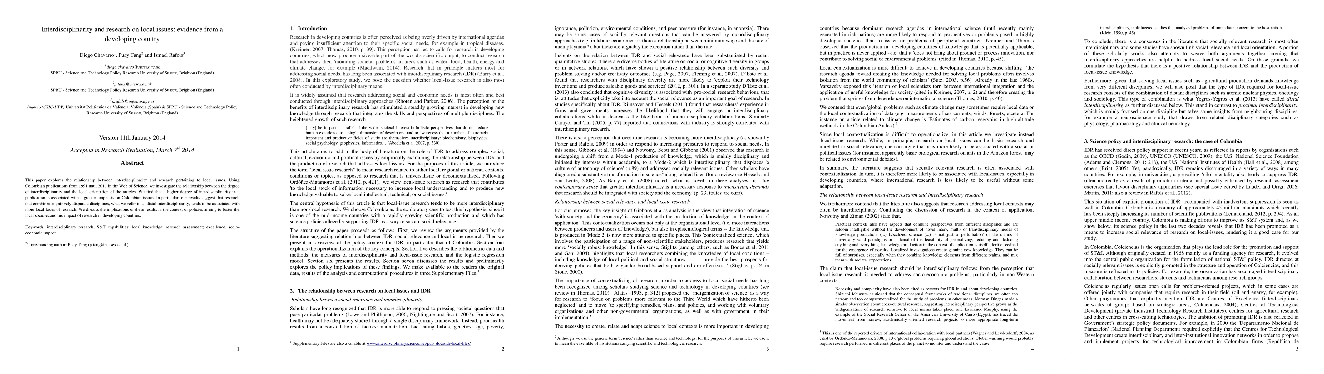This study examines the link between interdisciplinarity and research on local issues in Colombia, finding that more interdisciplinary work tends to focus more on local concerns. The research highlights the potential of combining disparate disciplines to enhance local socio-economic impact in developing countries.