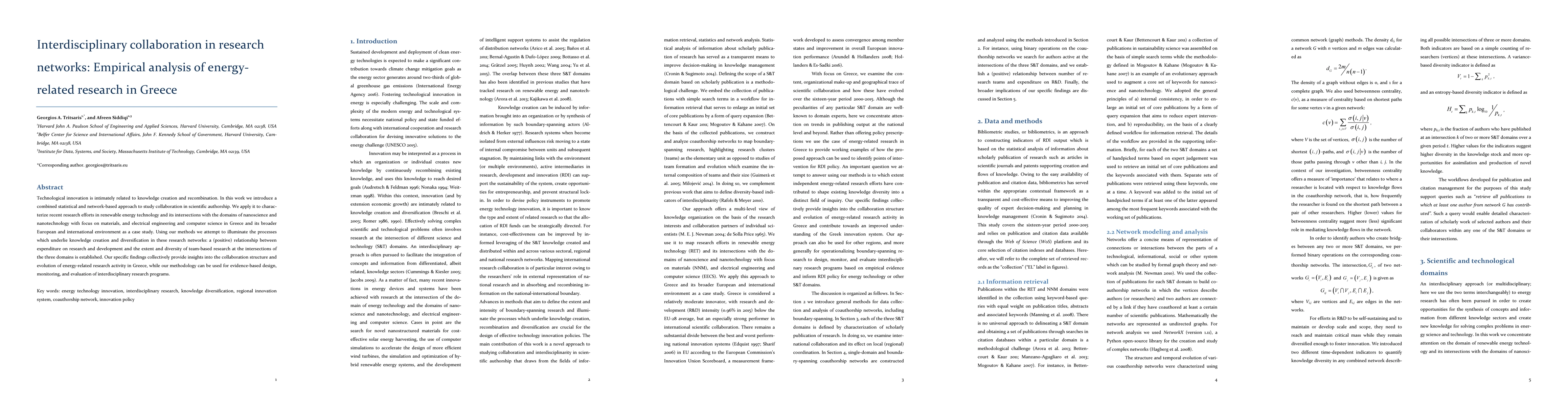 Technological innovation is intimately related to knowledge creation and recombination. In this work we introduce a combined statistical and network-based approach to study collaboration in scientific authorship. We apply it to characterize recent research efforts in renewable energy technology and its intersections with the domains of nanoscience and nanotechnology with focus on materials, and electrical engineering and computer science in Greece and its broader European and international environment as a case study. Using our methods we attempt to illuminate the processes which underlie knowledge creation and diversification in these research networks: a (positive) relationship between expenditure on research and development and the extent and diversity of team-based research at the intersections of the three domains is established. Our specific findings collectively provide insights into the collaboration structure and evolution of energy-related research activity in Greece, while our methodology can be used for evidence-based design, monitoring, and evaluation of interdisciplinary research programs.