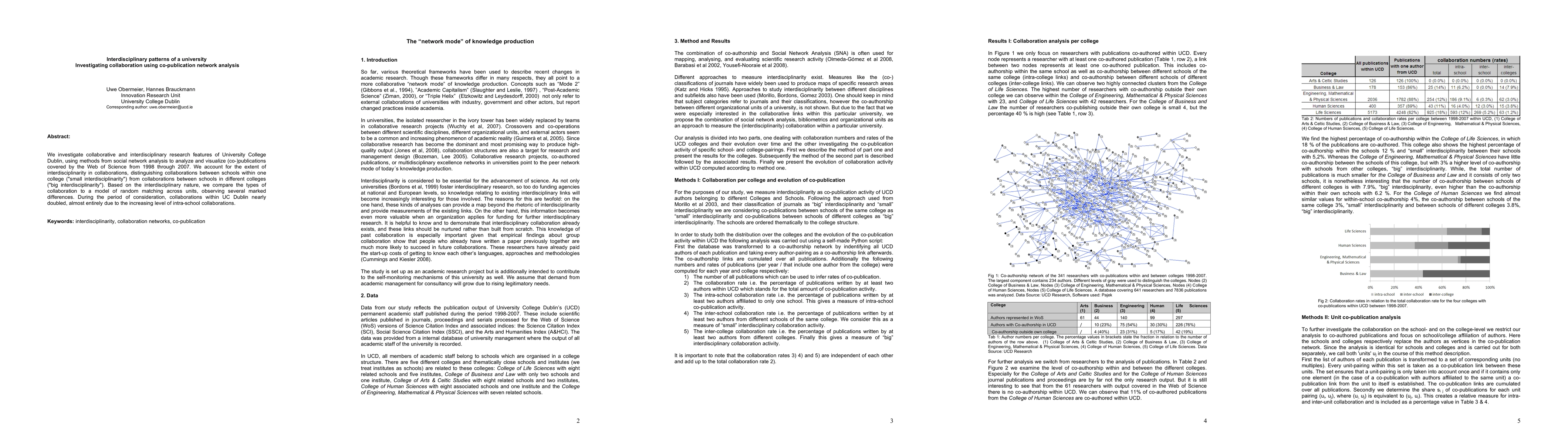 A study analyzed co-publication networks at University College Dublin to identify patterns of collaboration and interdisciplinarity from 1998-2007. It found nearly doubled collaborations within schools, mainly due to increased intra-school collaborations.
