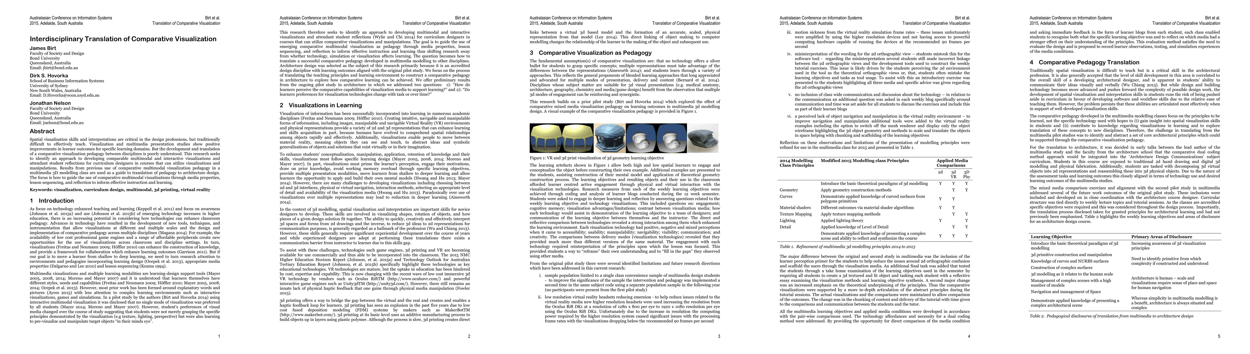 Spatial visualisation skills and interpretations are critical in the design professions, but traditionally difficult to effectively teach. Visualization and multimedia presentation studies show positive improvements in learner outcomes for specific learning domains. But the development and translation of a comparative visualization pedagogy between disciplines is poorly understood. This research seeks to identify an approach to developing comparable multimodal and interactive visualizations and attendant student reflections for curriculum designers in courses that can utilize visualizations and manipulations. Results from previous use of comparative multimodal visualization pedagogy in a multimedia 3D modelling class are used as a guide to translation of pedagogy to architecture design. The focus is how to guide the use of comparative multimodal visualizations through media properties, lesson sequencing, and reflection to inform effective instruction and learning.