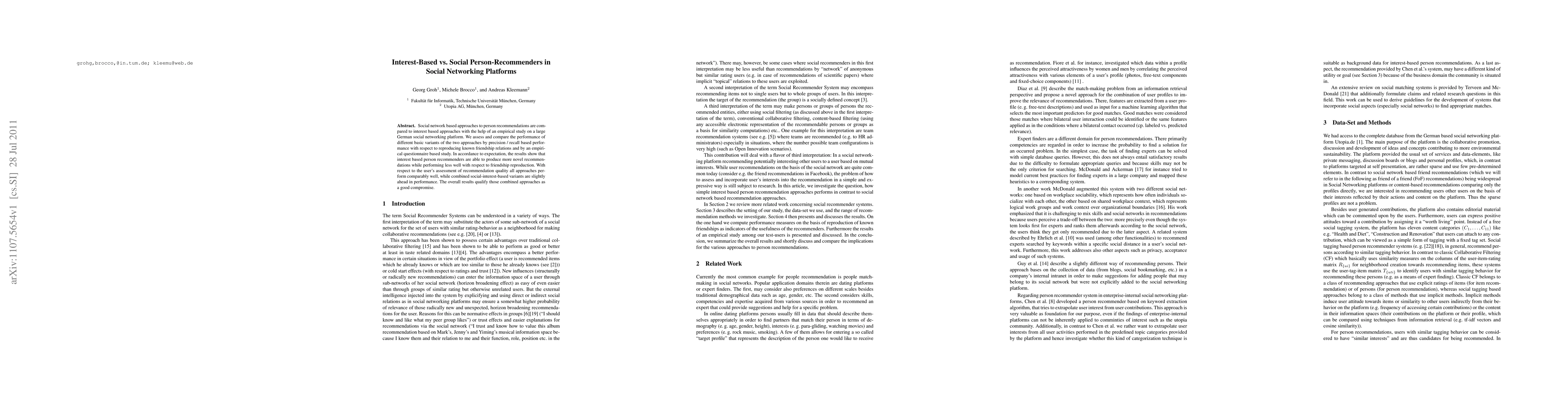 This study compares interest-based and social person-recommenders on a large German social networking platform, finding that interest-based recommenders generate more novel suggestions but are less effective at replicating known friendships. Combined social-interest approaches slightly outperform others in user-assessed recommendation quality.