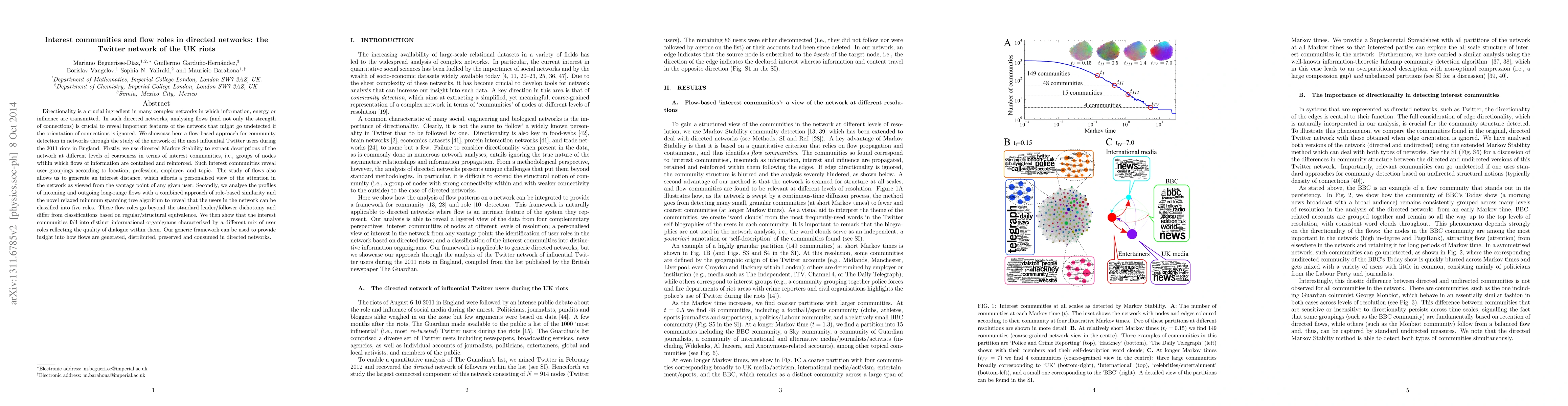 The study analyzes Twitter users during the 2011 UK riots to identify interest communities and flow roles, revealing user groupings by location, profession, and topic, and classifying them into five distinct roles with different informational qualities.