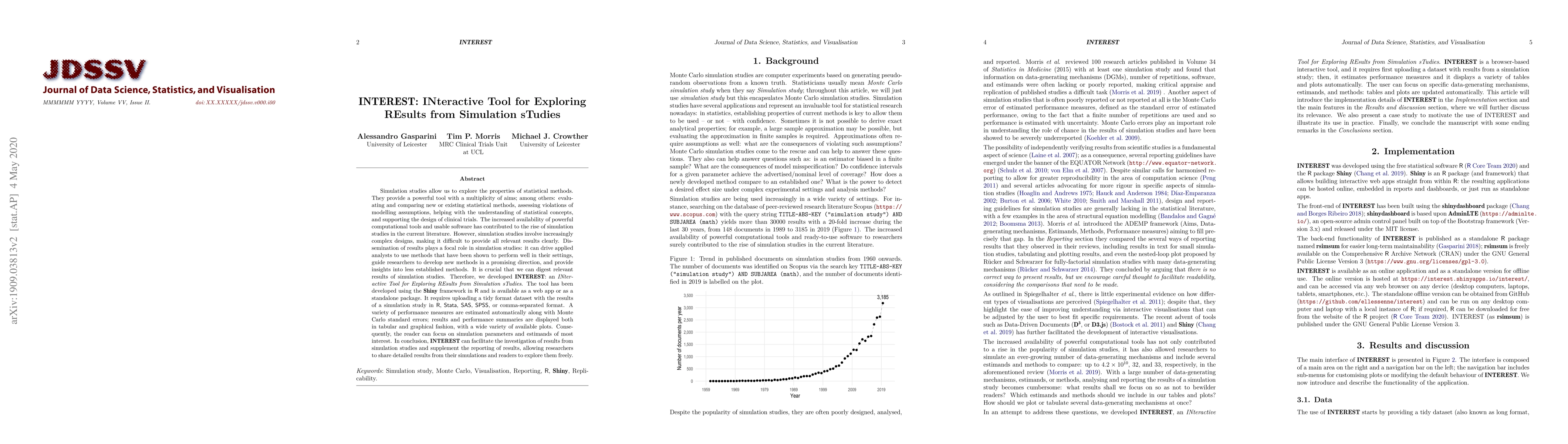 Simulation studies allow us to explore the properties of statistical methods. They provide a powerful tool with a multiplicity of aims; among others: evaluating and comparing new or existing statistical methods, assessing violations of modelling assumptions, helping with the understanding of statistical concepts, and supporting the design of clinical trials. The increased availability of powerful computational tools and usable software has contributed to the rise of simulation studies in the current literature. However, simulation studies involve increasingly complex designs, making it difficult to provide all relevant results clearly. Dissemination of results plays a focal role in simulation studies: it can drive applied analysts to use methods that have been shown to perform well in their settings, guide researchers to develop new methods in a promising direction, and provide insights into less established methods. It is crucial that we can digest relevant results of simulation studies. Therefore, we developed INTEREST: an INteractive Tool for Exploring REsults from Simulation sTudies. The tool has been developed using the Shiny framework in R and is available as a web app or as a standalone package. It requires uploading a tidy format dataset with the results of a simulation study in R, Stata, SAS, SPSS, or comma-separated format. A variety of performance measures are estimated automatically along with Monte Carlo standard errors; results and performance summaries are displayed both in tabular and graphical fashion, with a wide variety of available plots. Consequently, the reader can focus on simulation parameters and estimands of most interest. In conclusion, INTEREST can facilitate the investigation of results from simulation studies and supplement the reporting of results, allowing researchers to share detailed results from their simulations and readers to explore them freely.